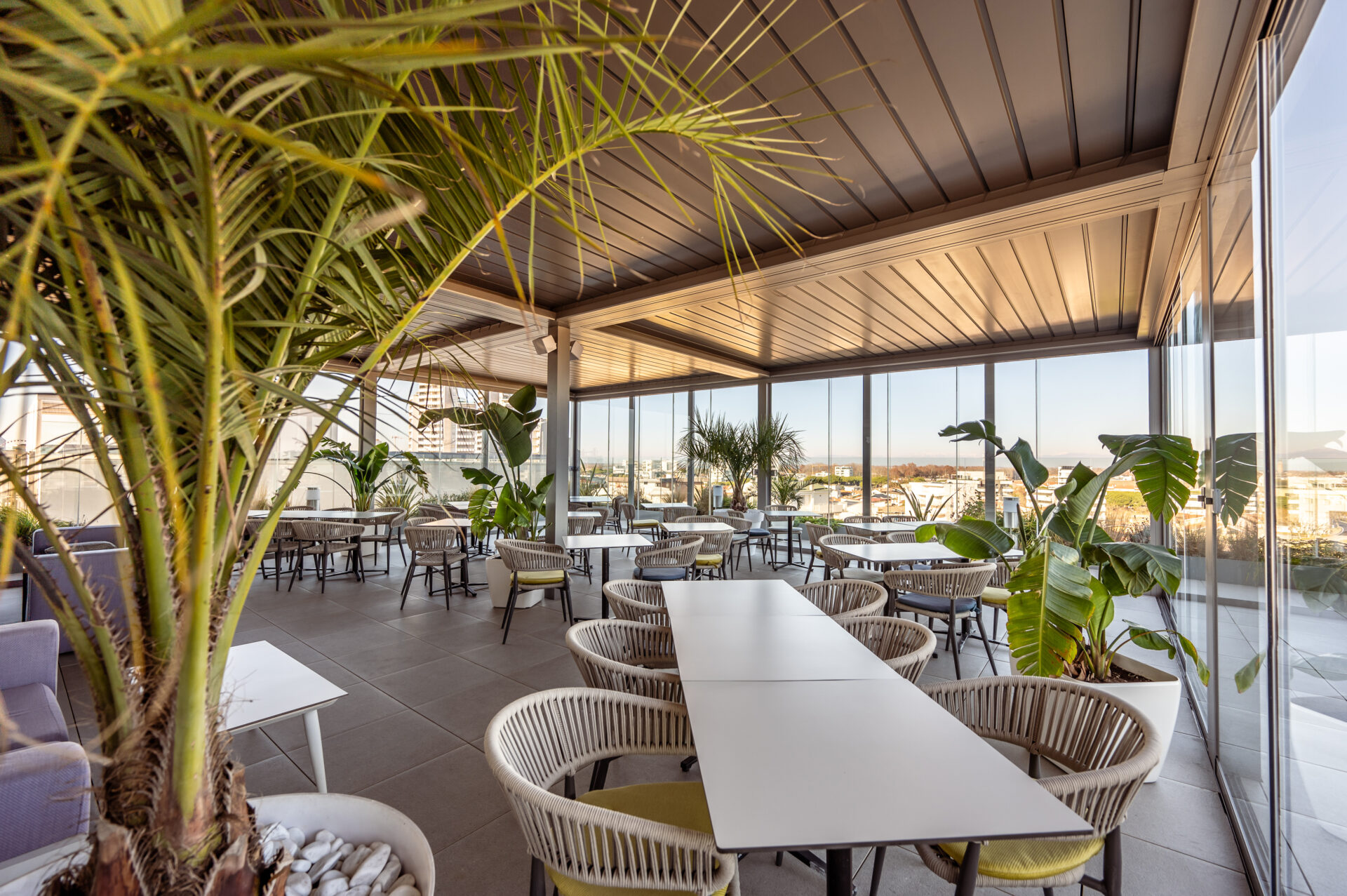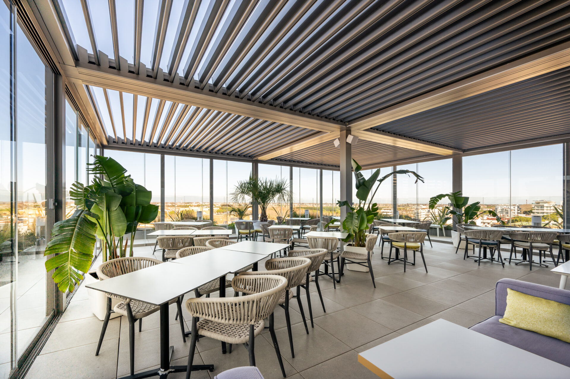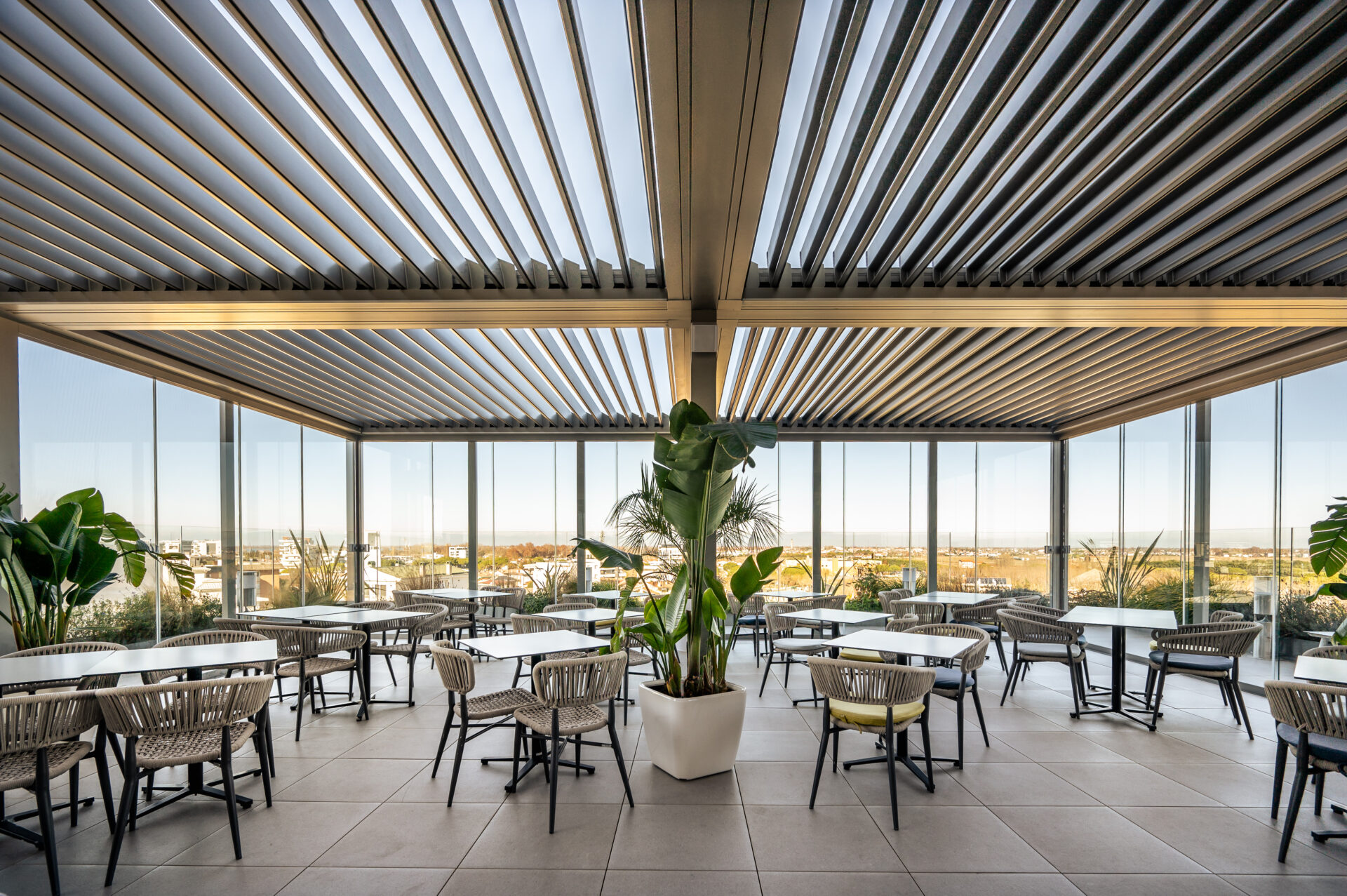 Bei dem Entwurf für J44 wurde die Farbe der Struktur, ein elegantes, mattes Aluminium, so gewählt, dass sie perfekt mit der minimalistischen und strengen Architektur des Hotels harmoniert. Die wesentliche Geometrie von Kedry Prime und das durch die verstellbaren Lamellen erzeugte Schattenspiel sind das kennzeichnende Element dieses Projekts, das durch das Vorhandensein einer einzigen zentralen Säule, die eine maximale Nutzbarkeit des Bistrobereichs garantiert, funktional wird. Um das Projekt zu vervollständigen, sorgen die Line Glass-Fenster, mit denen die Pergola an den Seiten geschlossen wird, dafür, dass der Ort bei jedem Wetter perfekt nutzbar ist. Die Line Glass-Fenster auf drei Seiten der Struktur bewahren außerdem die Schönheit des umgebenden Panoramas.