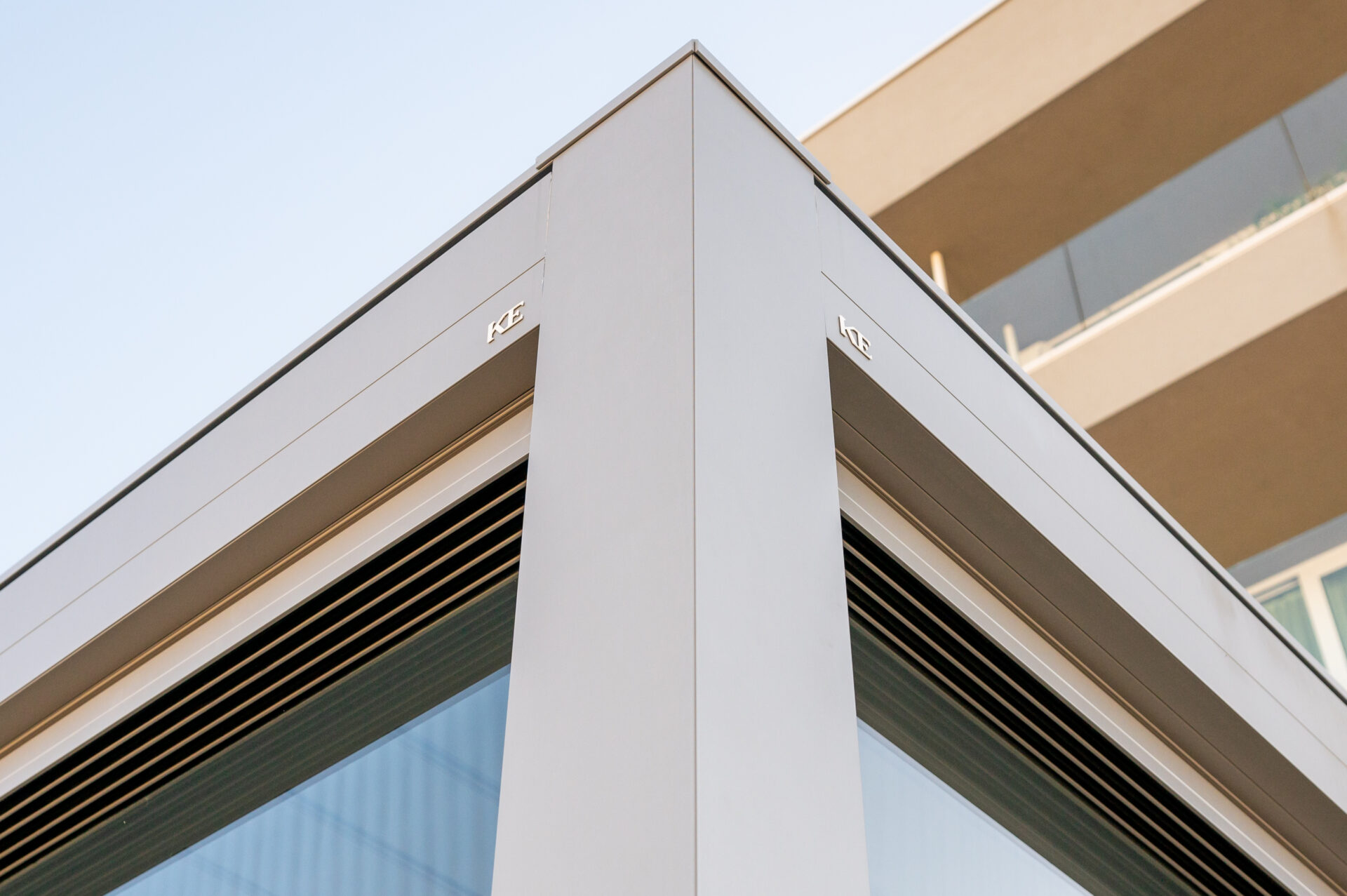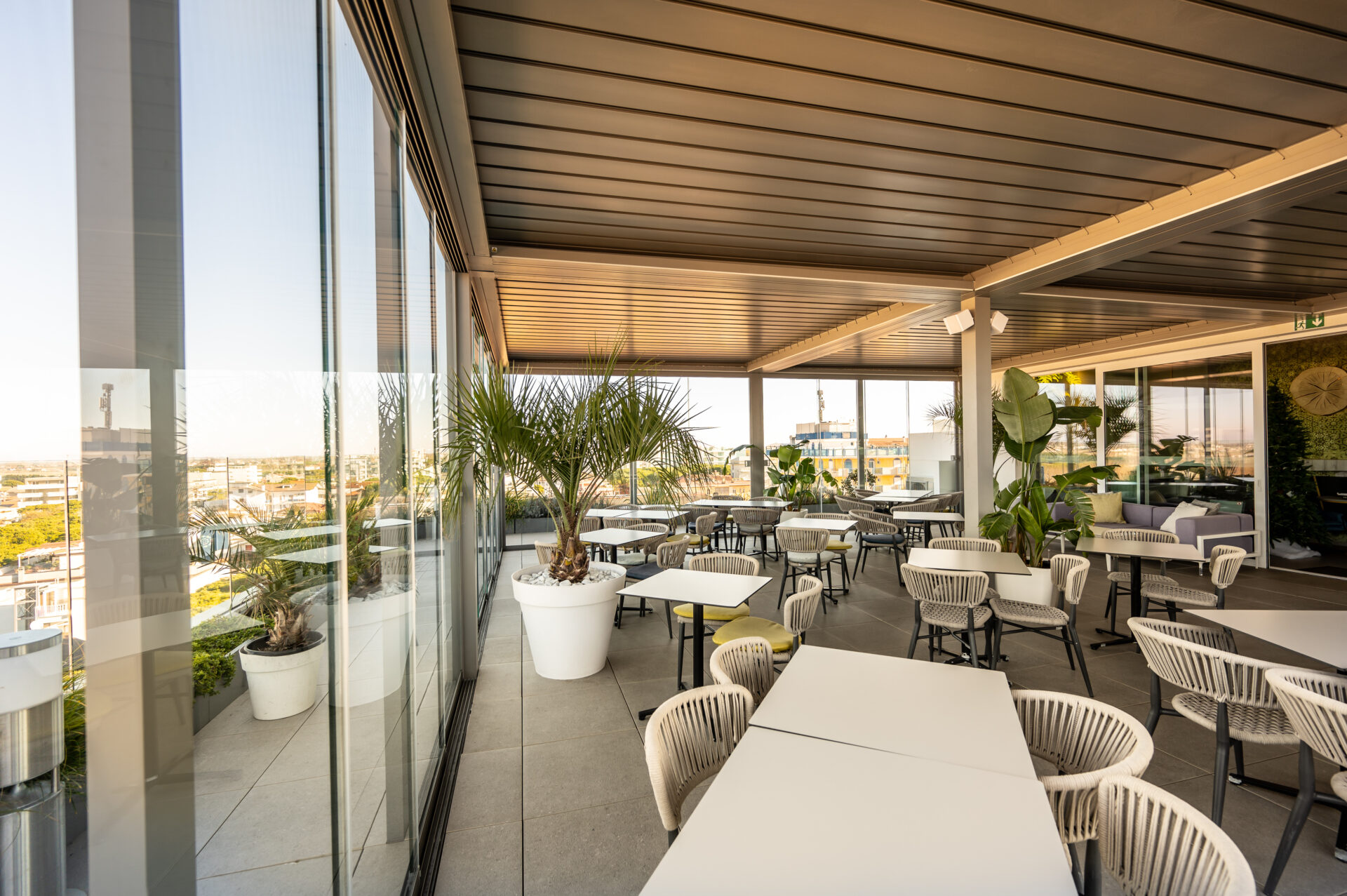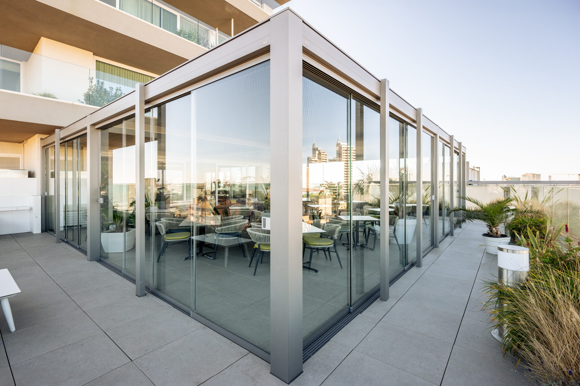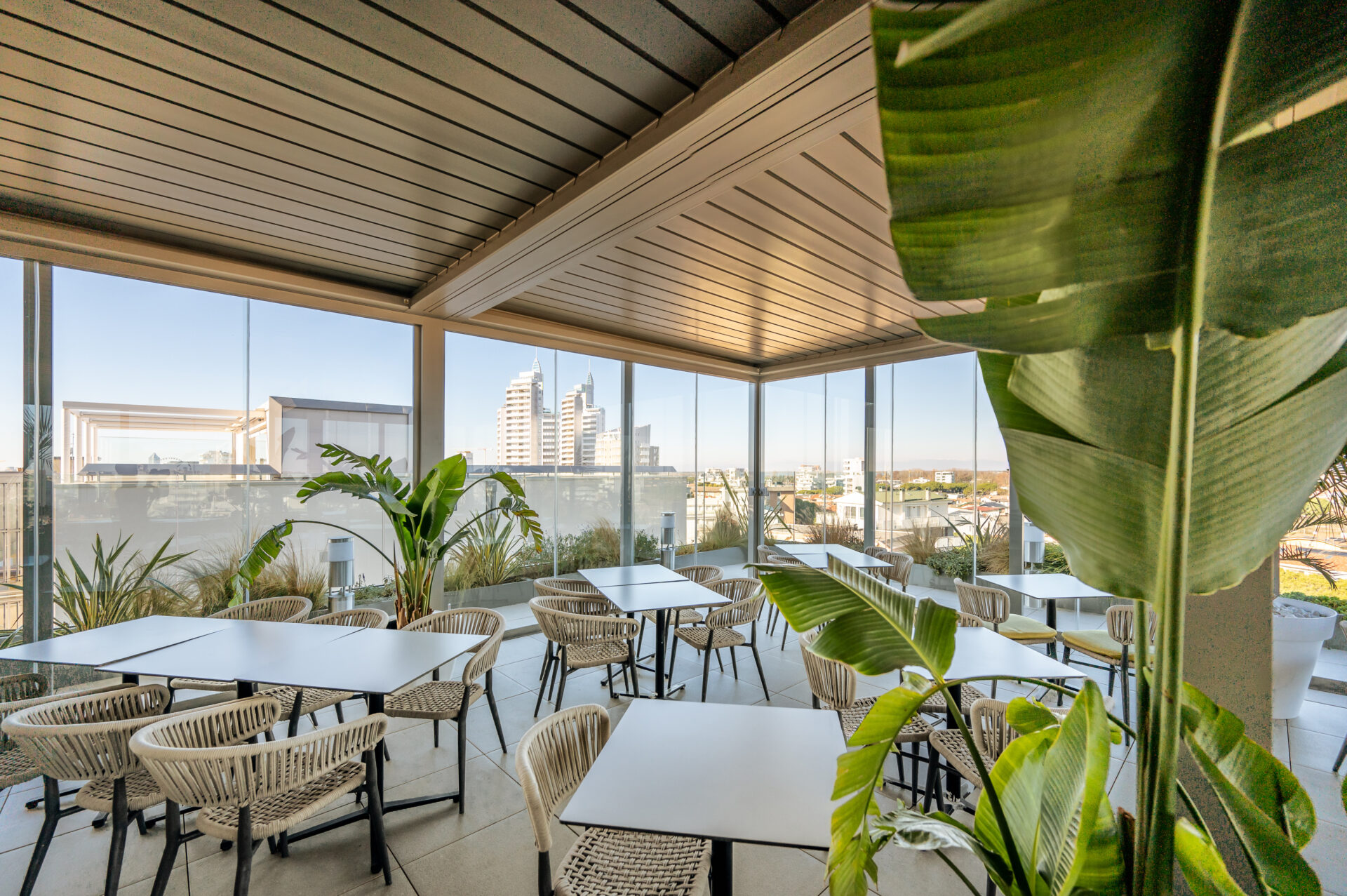 Bei dem Entwurf für J44 wurde die Farbe der Struktur, ein elegantes, mattes Aluminium, so gewählt, dass sie perfekt mit der minimalistischen und strengen Architektur des Hotels harmoniert. Die wesentliche Geometrie von Kedry Prime und das durch die verstellbaren Lamellen erzeugte Schattenspiel sind das kennzeichnende Element dieses Projekts, das durch das Vorhandensein einer einzigen zentralen Säule, die eine maximale Nutzbarkeit des Bistrobereichs garantiert, funktional wird. Um das Projekt zu vervollständigen, sorgen die Line Glass-Fenster, mit denen die Pergola an den Seiten geschlossen wird, dafür, dass der Ort bei jedem Wetter perfekt nutzbar ist. Die Line Glass-Fenster auf drei Seiten der Struktur bewahren außerdem die Schönheit des umgebenden Panoramas.