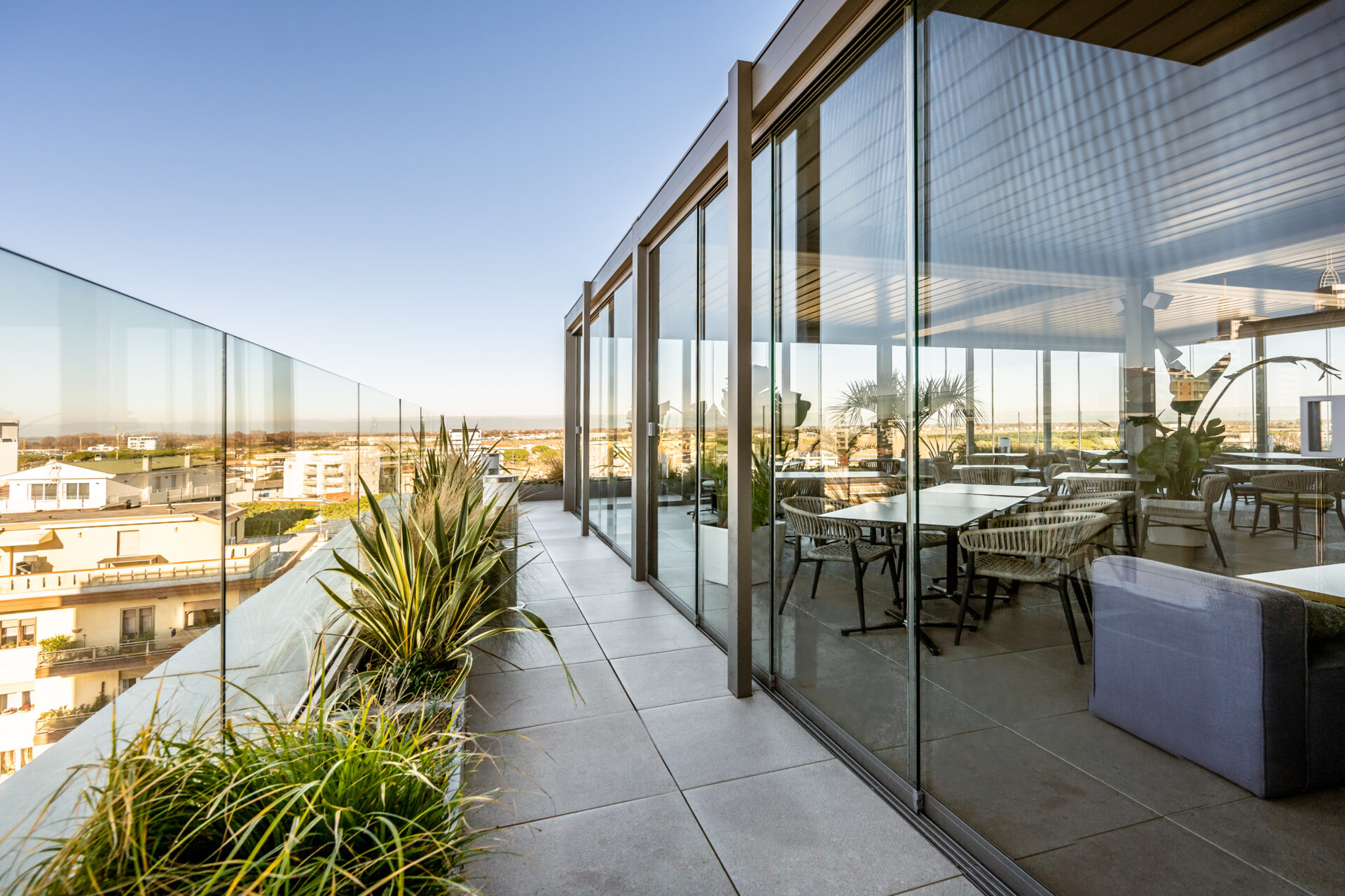 Schaffung einer überdachten Terrasse für die amerikanische Bar Tacco11: ein Projekt, das der Kunde unbedingt wünschte, um den Aufenthalt der Gäste noch exklusiver und magischer zu machen durch die Erfahrung einer vollständig verglasten Terrasse, von der aus sie die Skyline von Jesolo bis hin zur Lagune von Venedig bewundern können.