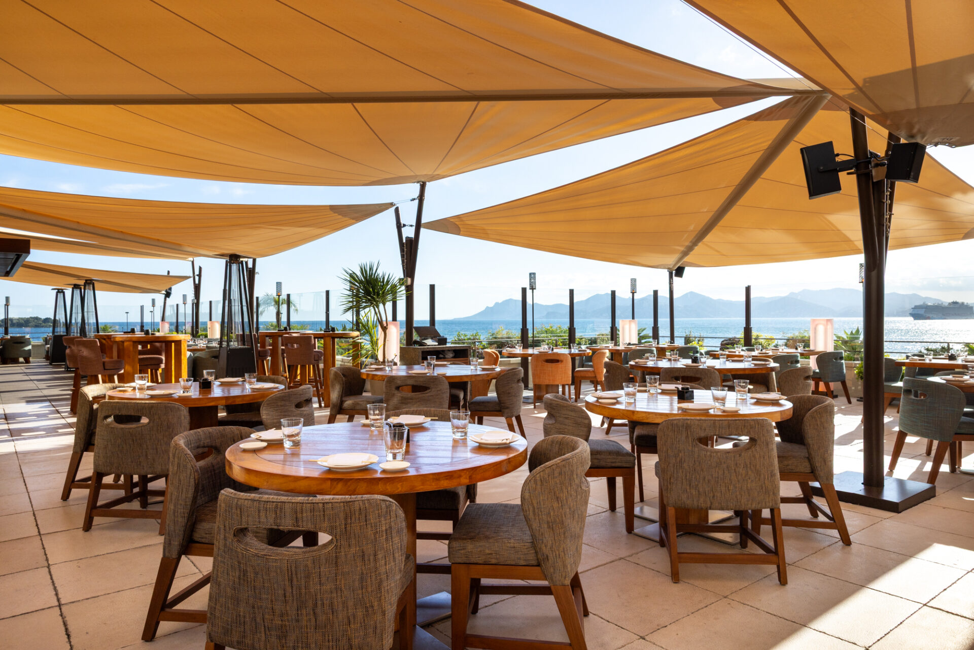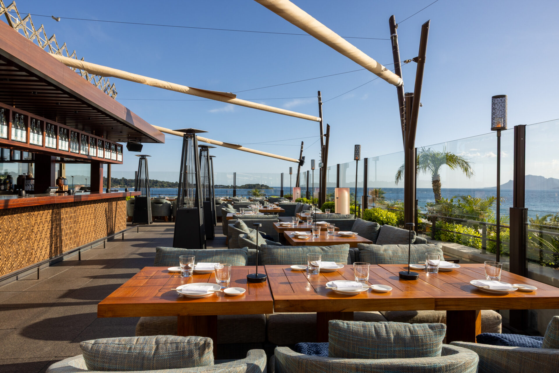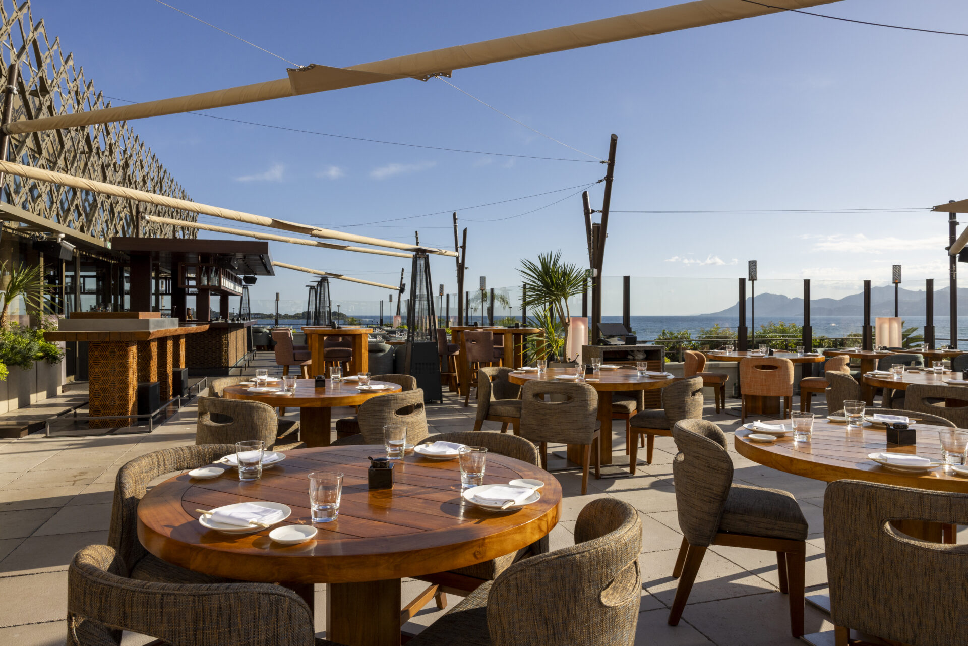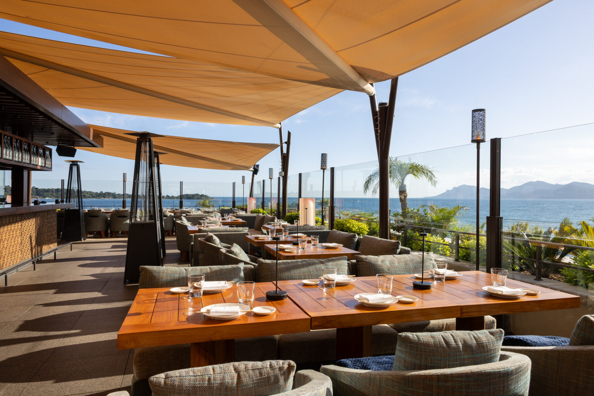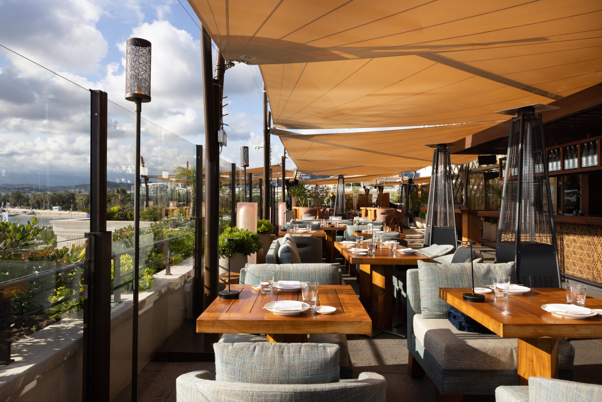 Die Eigentümer von Zuma Cannes wünschten sich einen eleganten und stilvollen Außenbereich auf der Panoramaterrasse des Restaurants. Ziel war es, einen einladenden Bereich zu schaffen, der effektiven Schutz vor Sonne und Witterung bietet – ohne die Aussicht zu beeinträchtigen.