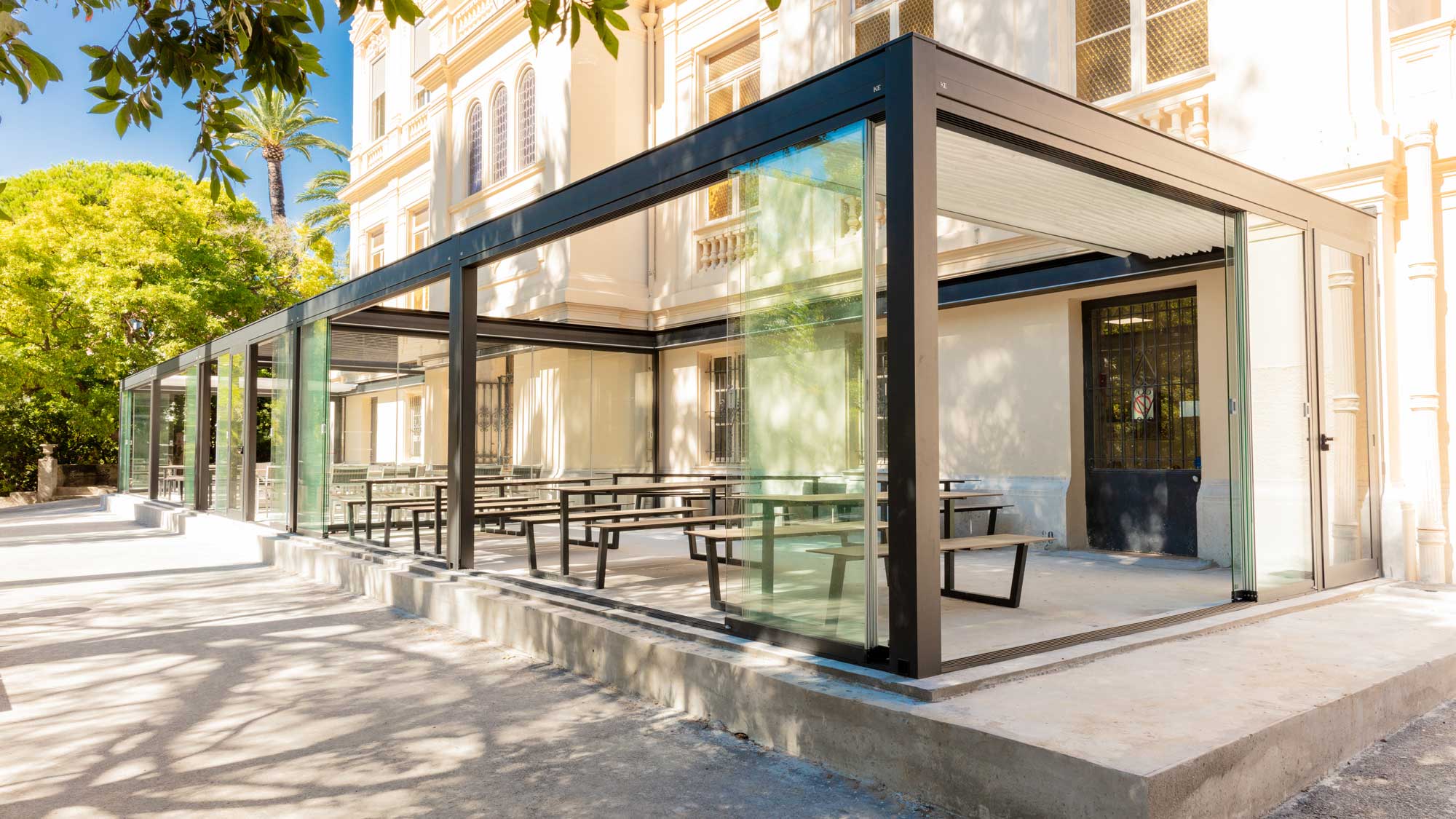 The outdoor area of the historic villa where the school is located has been beautifully renovated using outdoor shading products from KE. The school turned to KE’s PMO Office to propose the best solution to create a new, elegant and functional way to bring the indoors outside for this new, year-round, outdoor dining space.