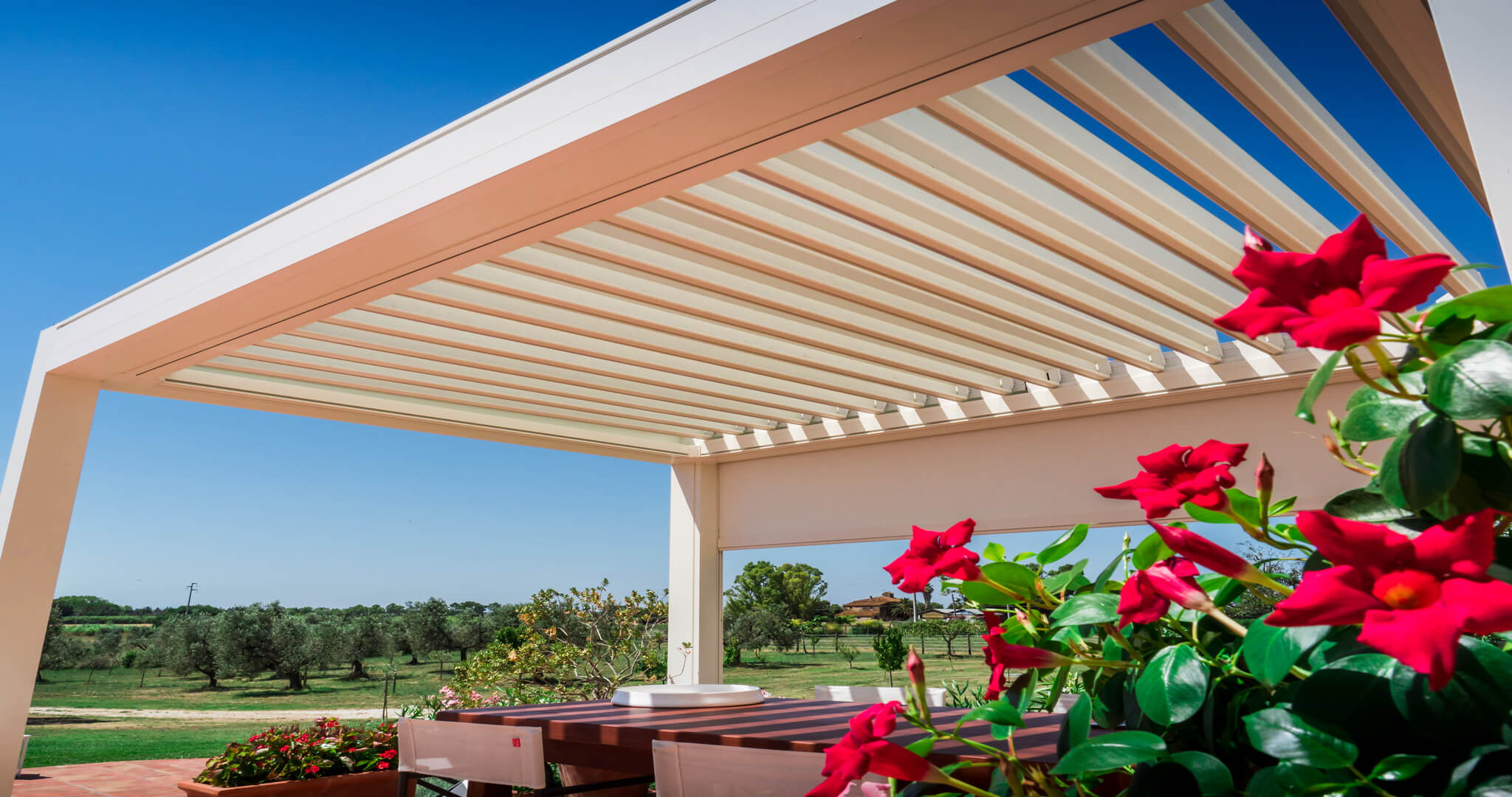 Thanks to its sophisticated style and elegant shapes, Kedry Prime proved to be the ideal solution; basic features are the high flexibility and the possibility of customizing the pergola: in fact it can be integrated with filtering roller awnings or side panoramic glasses.
