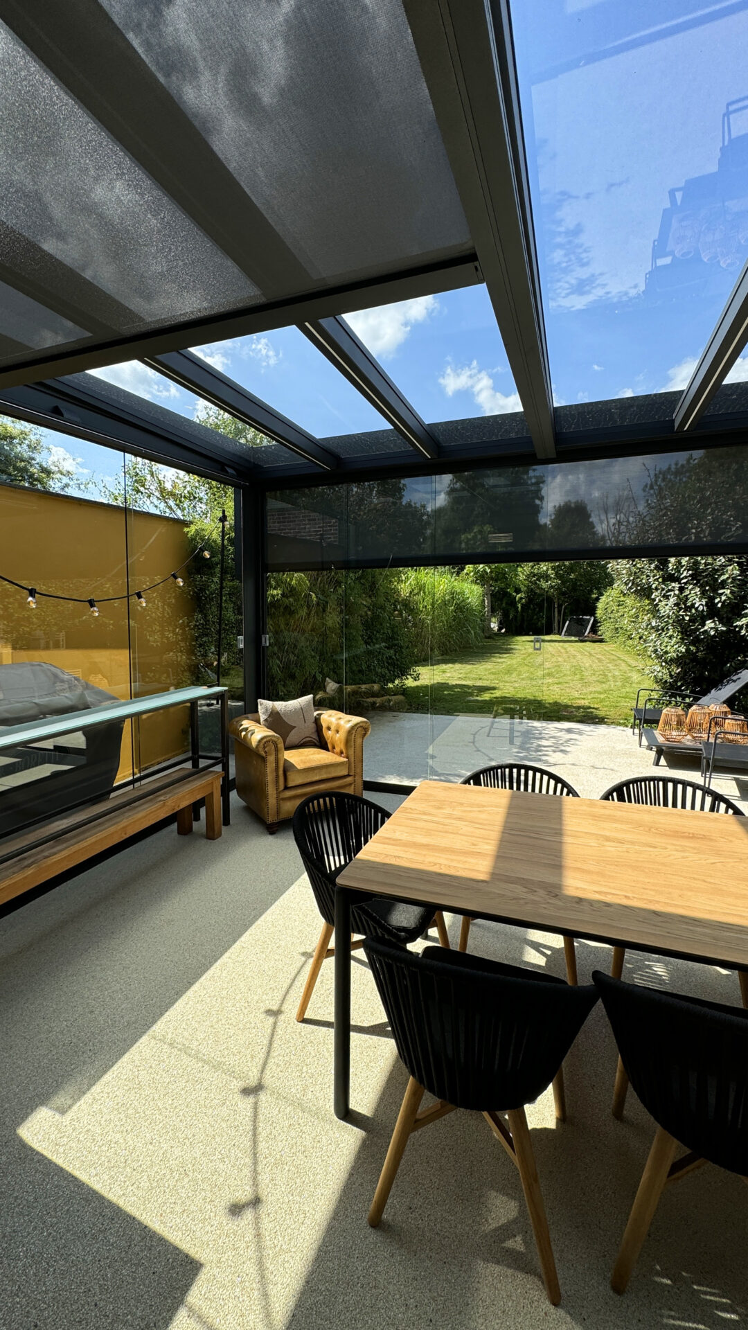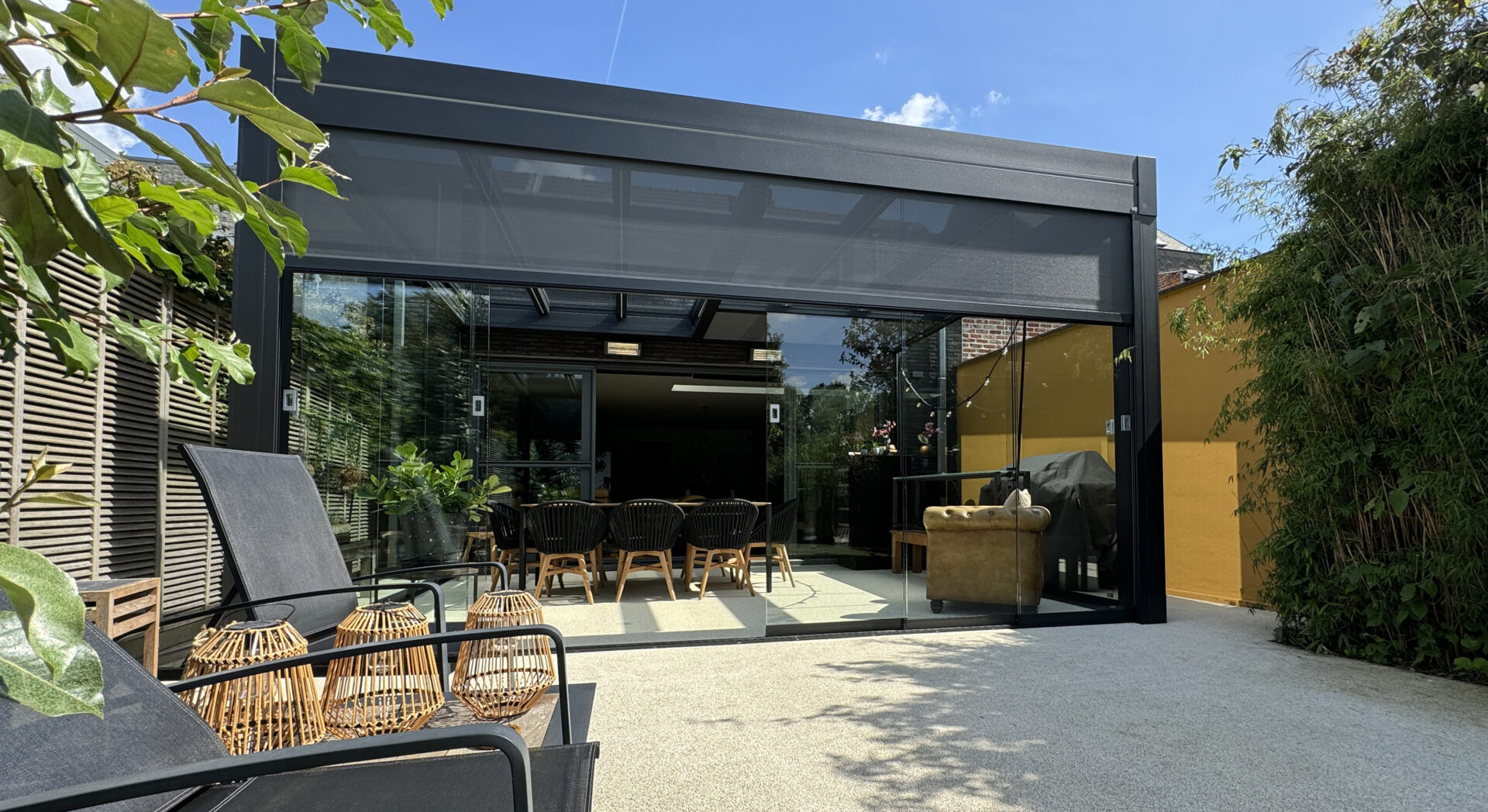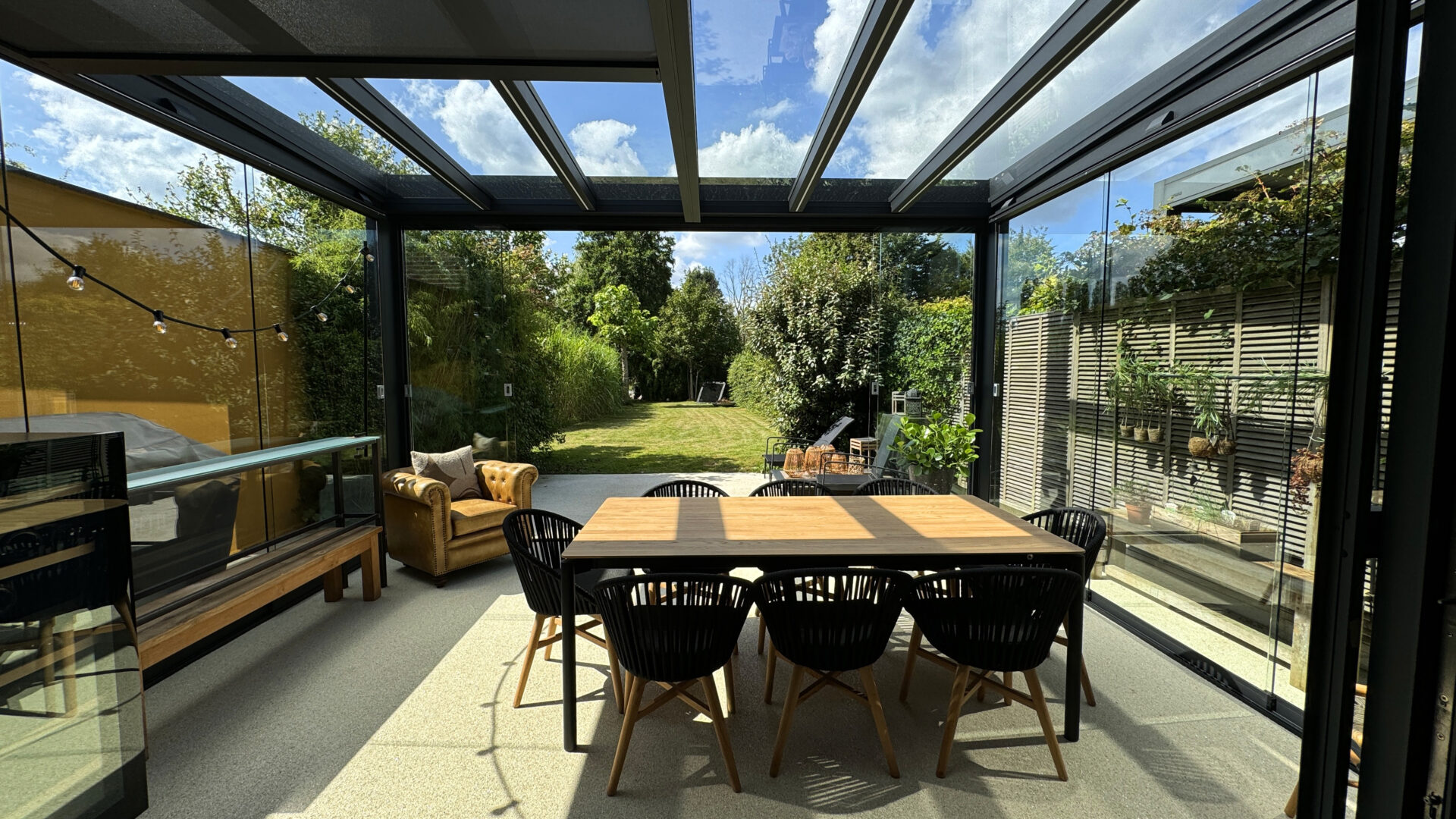 - Puede cerrarse con persianas técnicas verticales integradas, sistemas de acristalamiento deslizantes y Roof tens para dar sombra por encima y por debajo del tejado