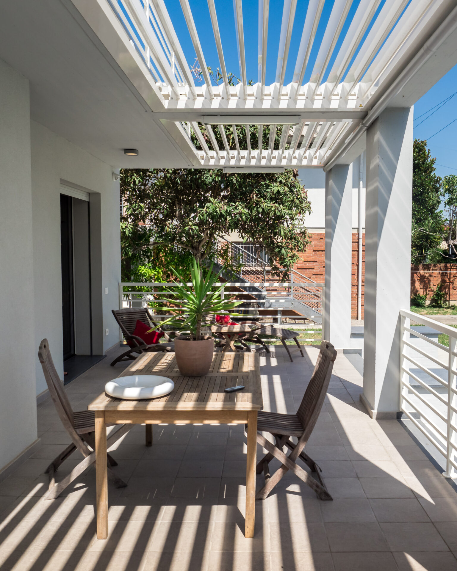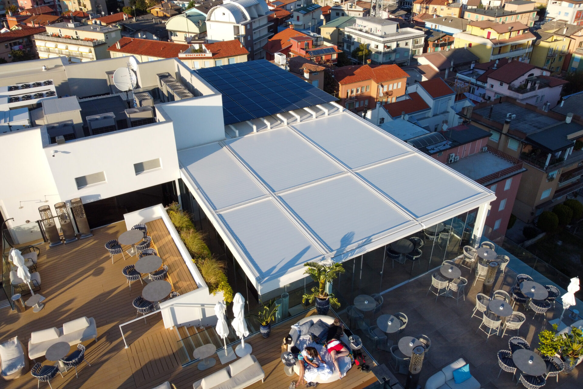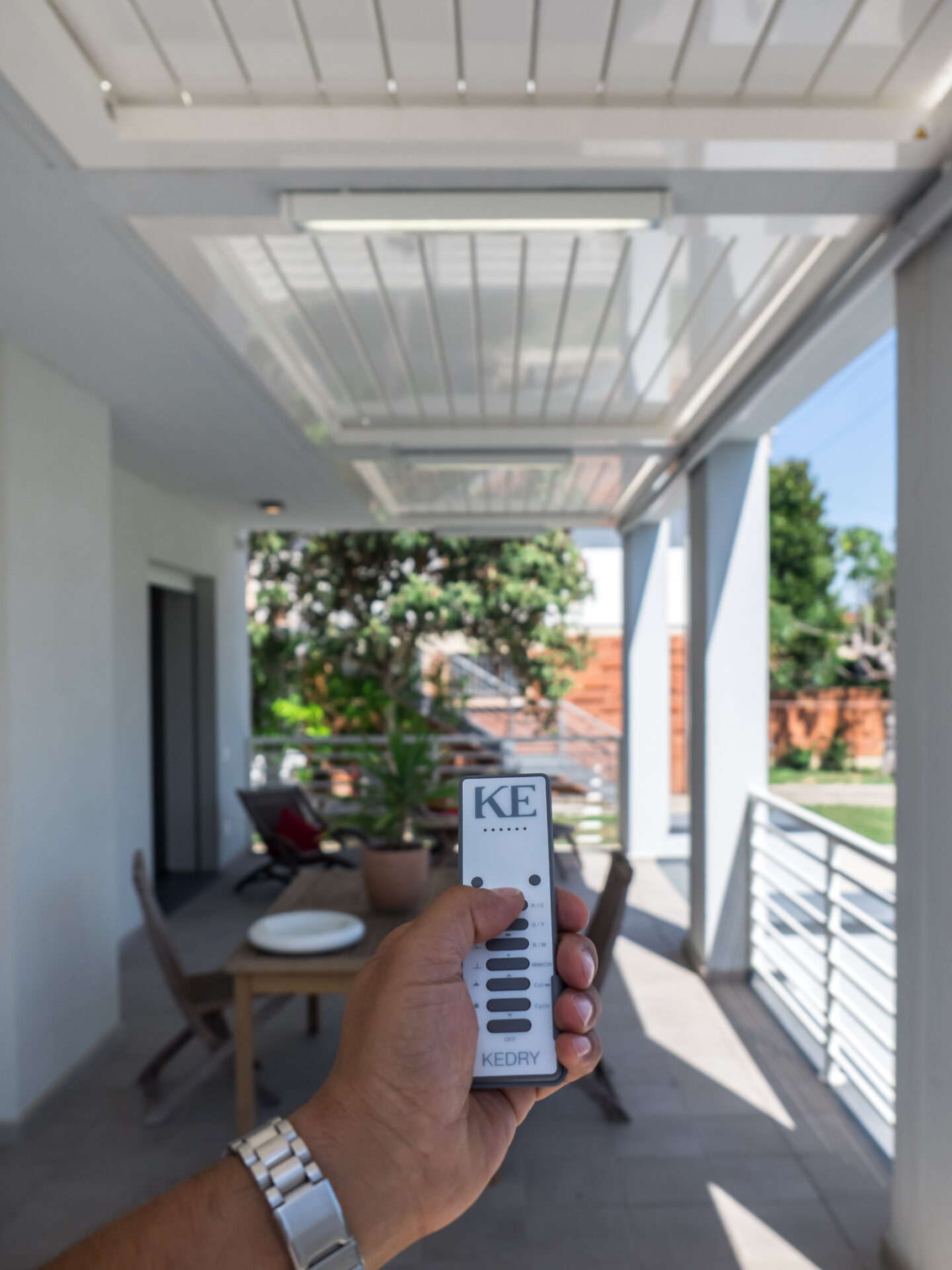 Estructura sombreante autoportante en aluminio con techo de lamas orientables compuesta de un perfil canalón perimetral que permite la rotación de las lamas y la descarga del agua.