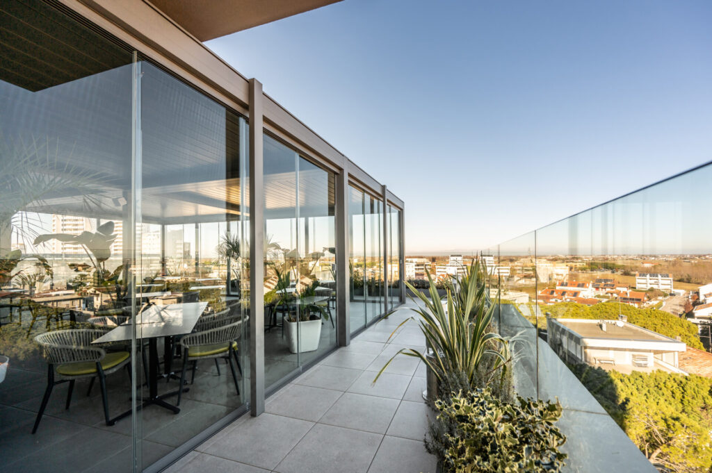 Las hojas orientables de Kedry PRIME permiten al propietario de casa jugar con luces y sombras, mientras que los toldos perimetrales transparentes protegen de la lluvia y del viento que una exposición tan grande conlleva.