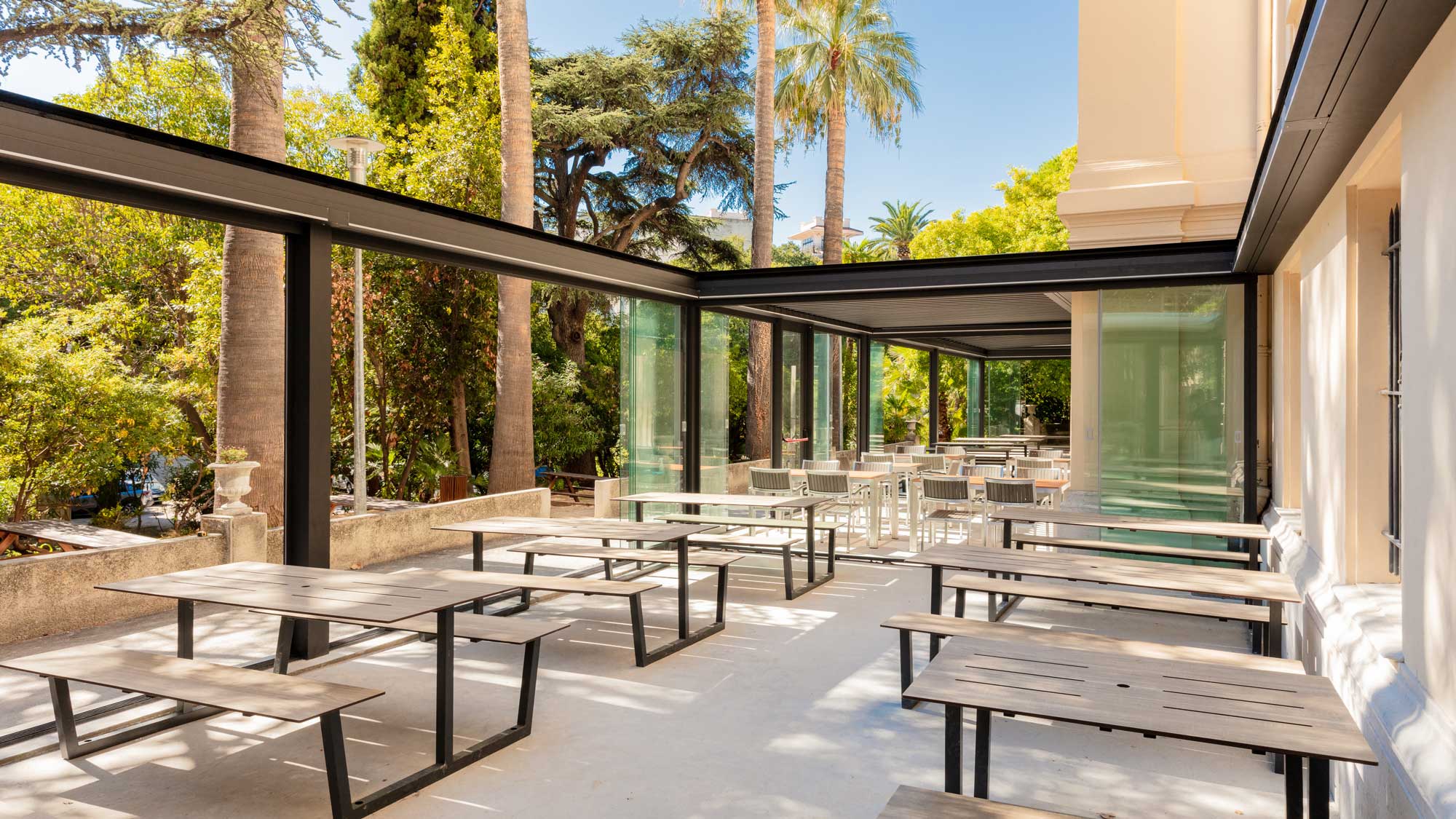 Une solution qui allie style et qualité : les lignes essentielles de l’Isola 3 et Kedry Prime, ici en couleur Noir Inver (Carbon), s’intègrent parfaitement avec le bâtiment scolaire et avec le parc séculaire qui l’entoure. La personnalisation du projet est passée par l’ajout d’un système de vitrage panoramique extérieur pour une protection au vent et à la pluie, mais également intérieur, pour séparer la zone étudiante de la zone enseignante, ainsi que l’installation de trois portes avec poignée anti panique qui répondent aux exigences d’accessibilité et de sécurité.