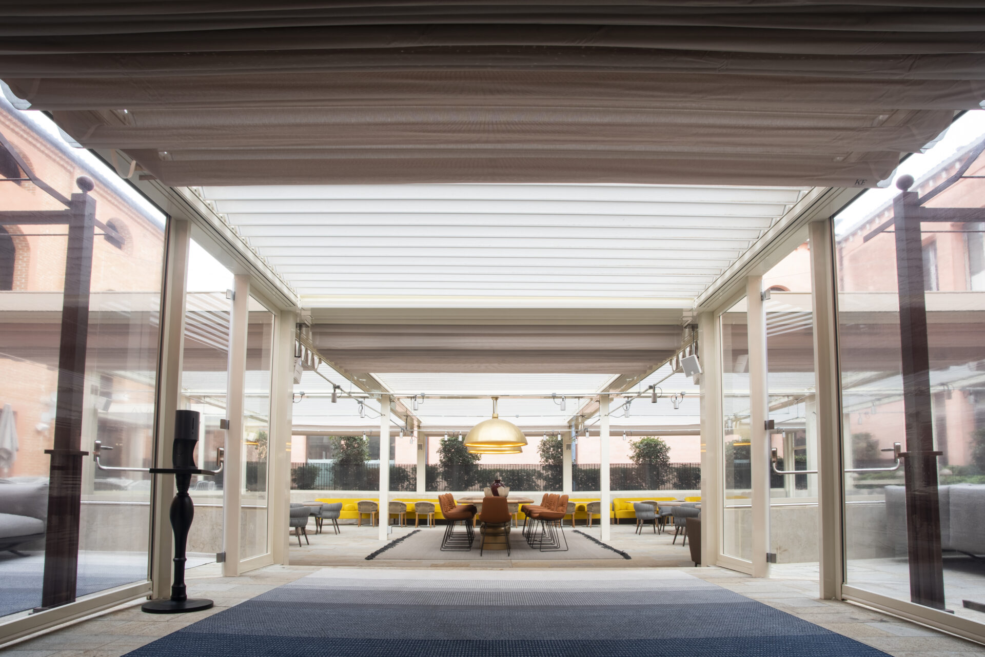 Sous le toit à lames de Kedry Prime, 9 stores filtrants T1 avec toile à empaquêtement motorisés ont été installés.