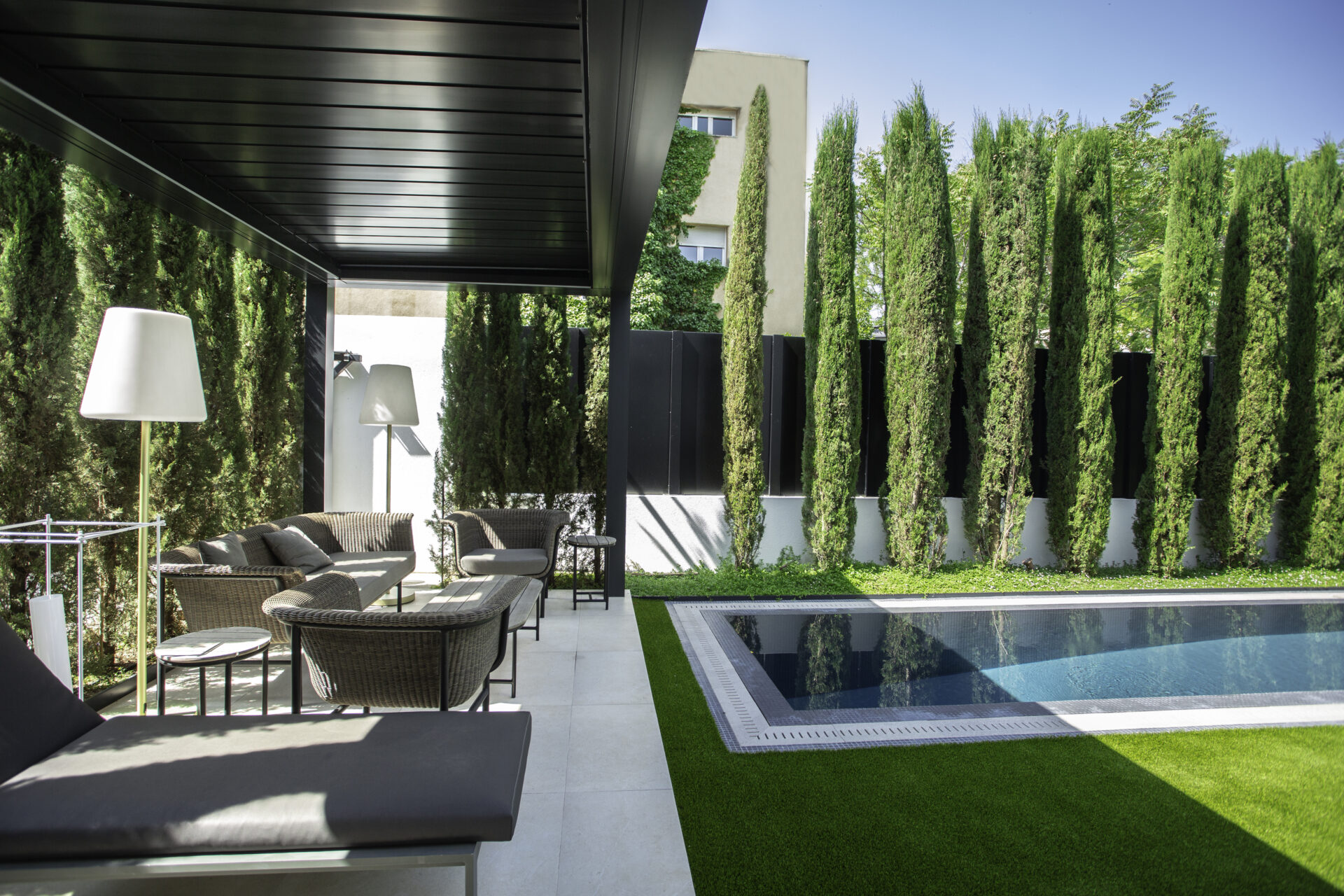 KE firma il salotto a bordo piscina e il roof top outdoor di una villa nel centro di Madrid