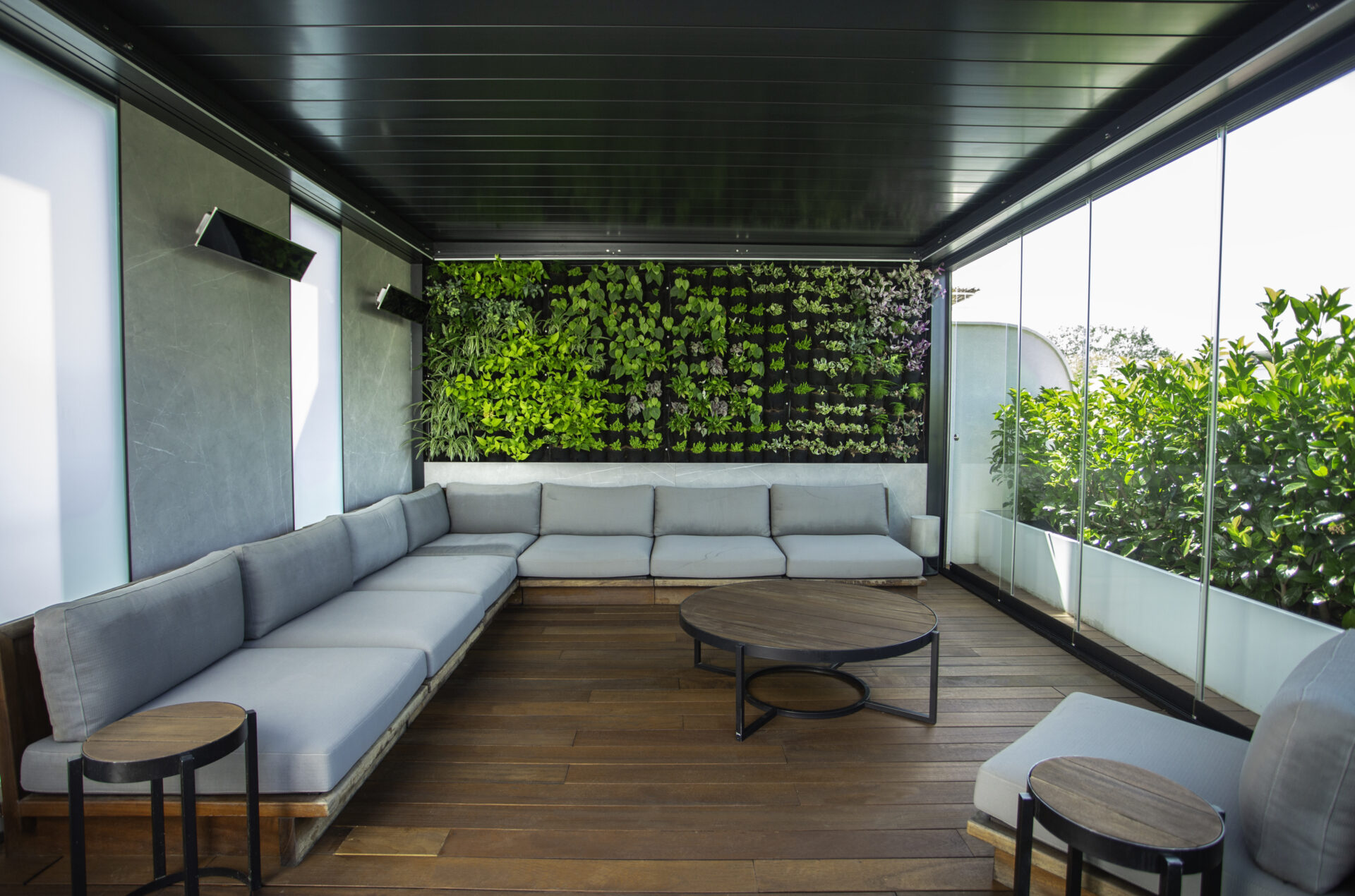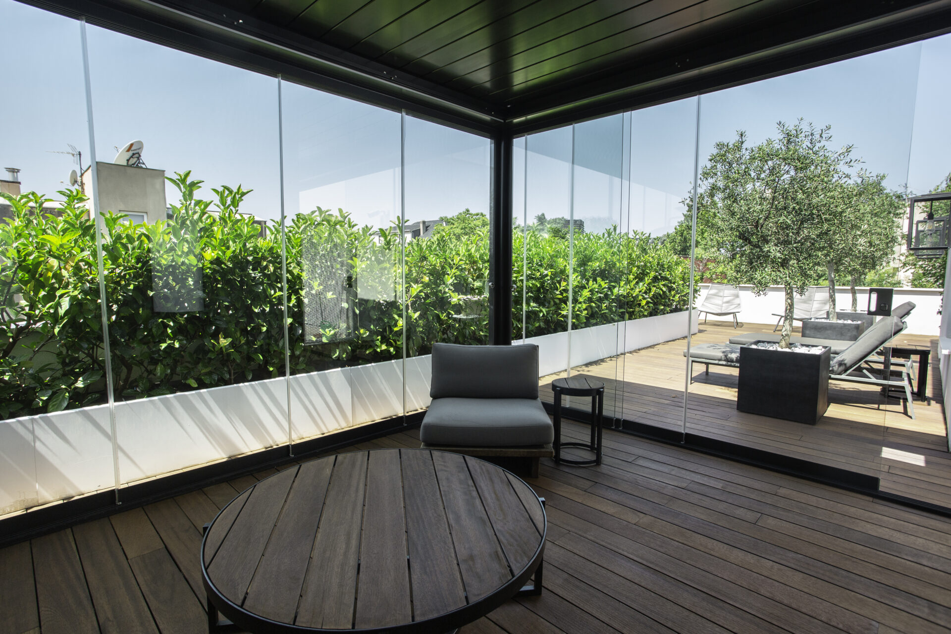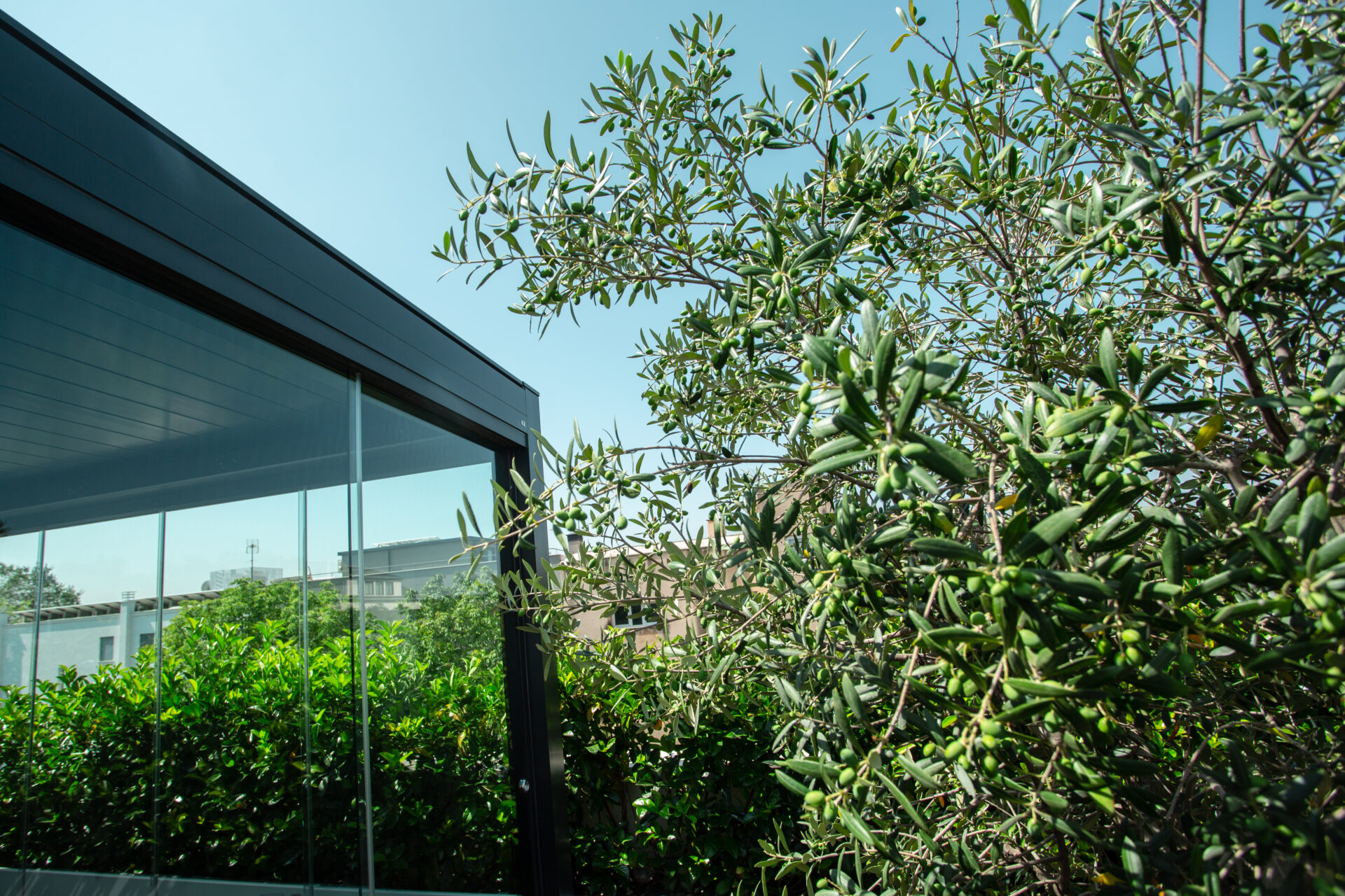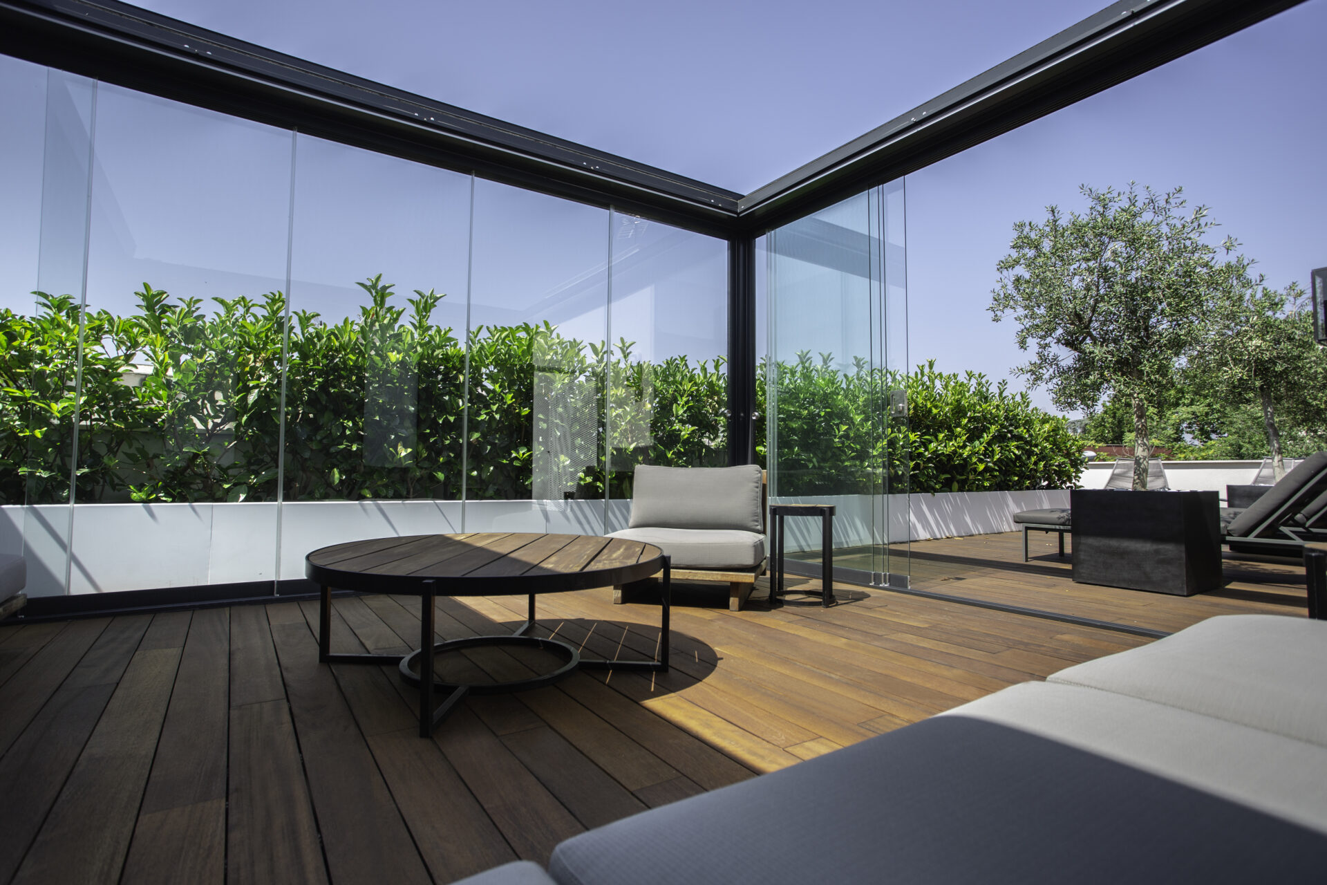 A completare le due pergole sono state scelte le vetrate Line Glass per un effetto tutto vetro che amplifica la scenografia di entrambe. Il sistema di chiusura, composto da vetrate scorrevoli su binario è facile da installare e privo di profili perimetrali, assicura la massima versatilità progettuale e funzionalità del tutto esclusive. Il tutto, con l’affidabilità, la sicurezza e il design di un prodotto interamente realizzato in Italia. Soluzione ideale per vivere la propria pergola, al riparo da vento, pioggia e rumore, il sistema si caratterizza per il design lineare. Grazie agli ingombri ridotti e all’effetto “tutto vetro”, aumenta la luminosità degli ambienti, consentendo di vivere a stretto contatto con il paesaggio circostante, in un dialogo continuo tra indoor e outdoor.