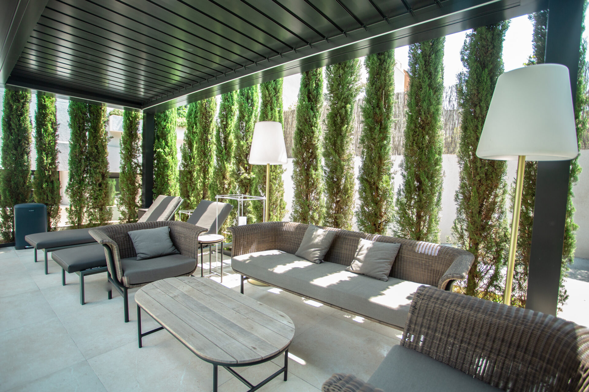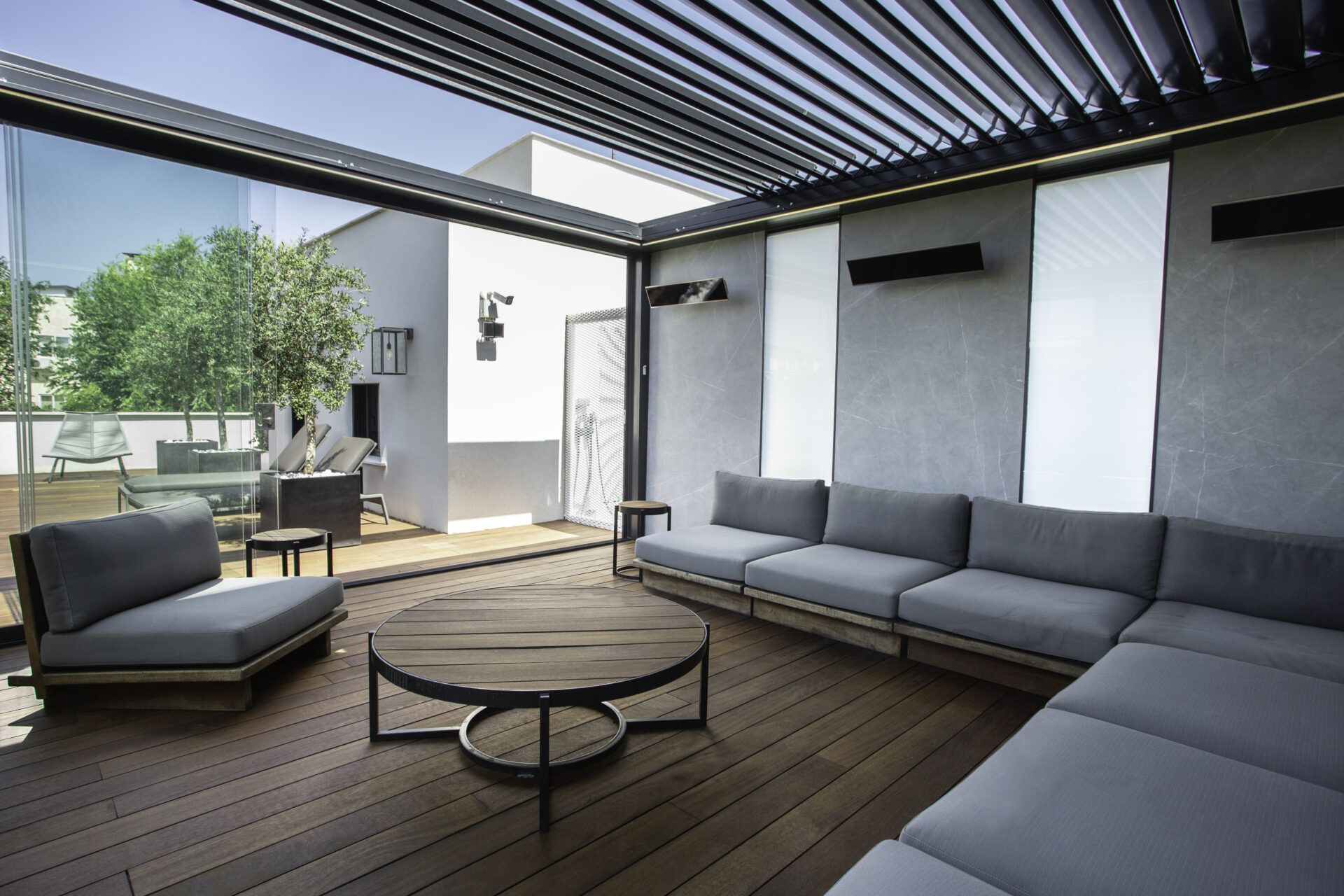 Il desiderio della committenza di creare un’atmosfera ancora più calda e raffinata è stato esaudito proponendo una soluzione customizzata: le strutture infatti ospitano anche luci perimetrali interne a Led dimmerabili. In tal modo è possibile usufruirne anche nelle ore serali.