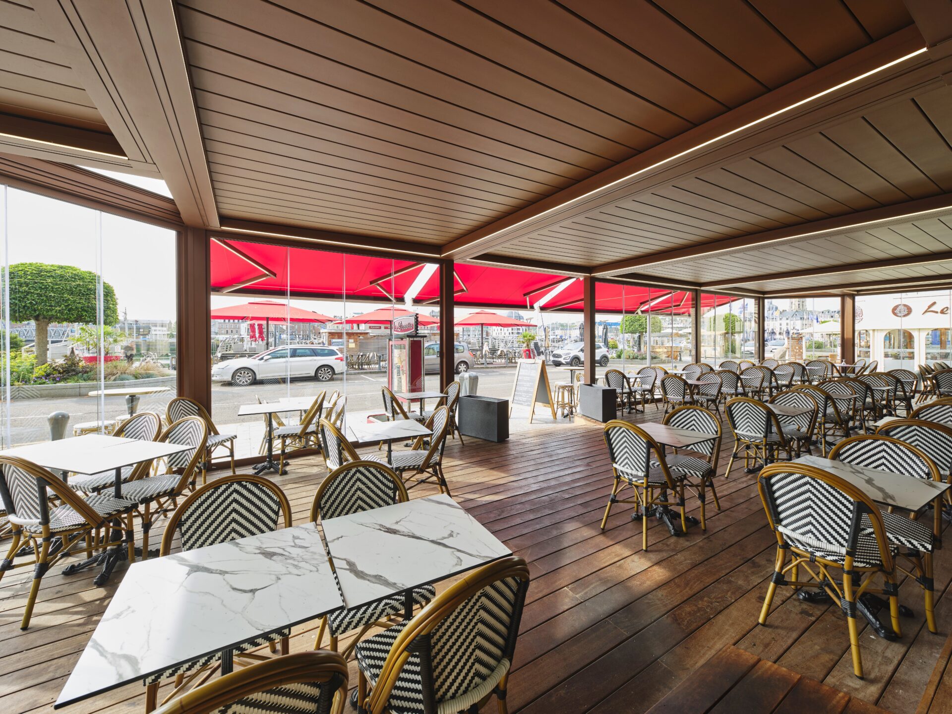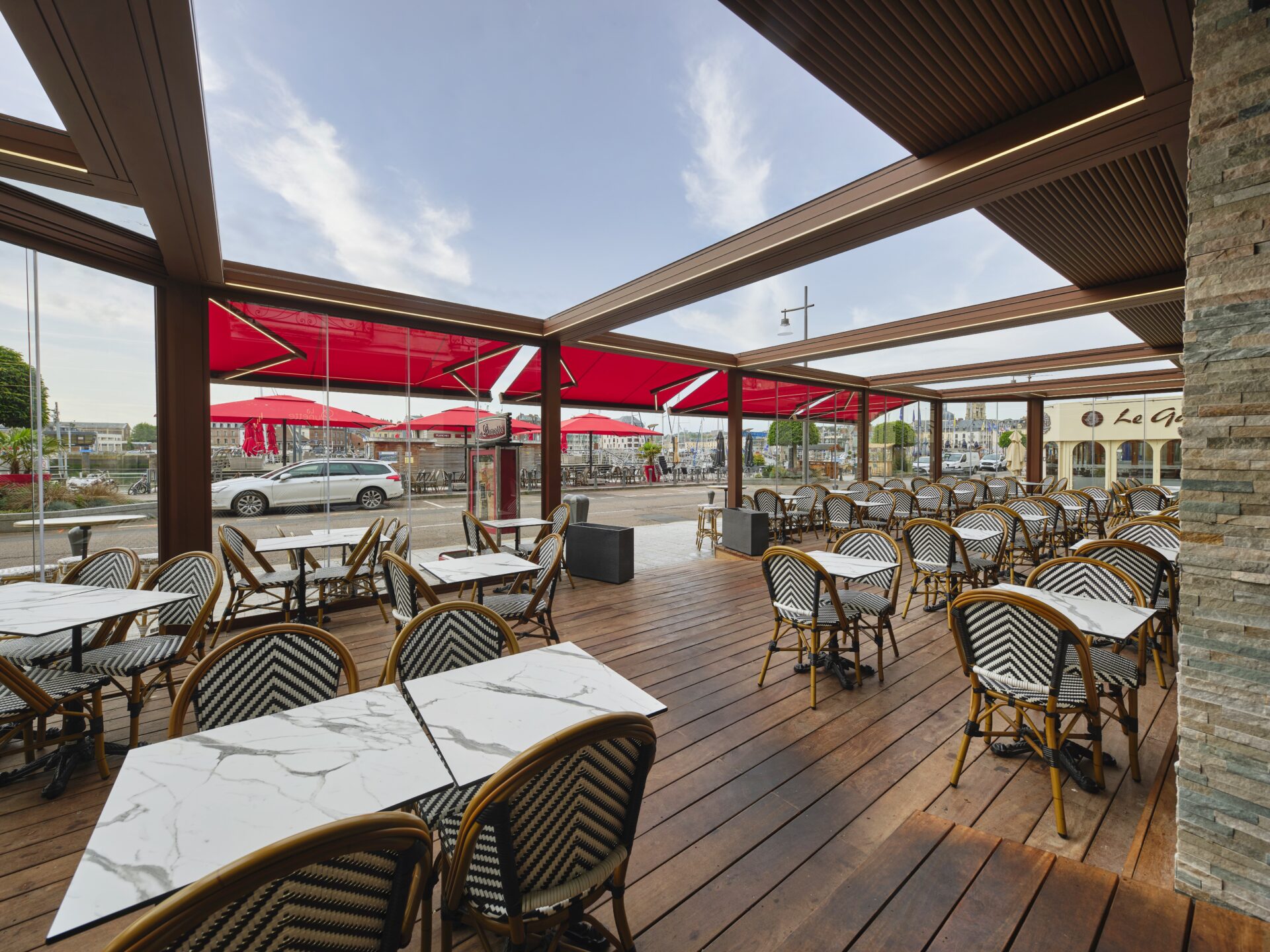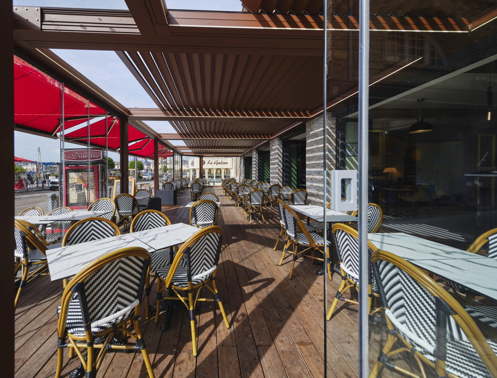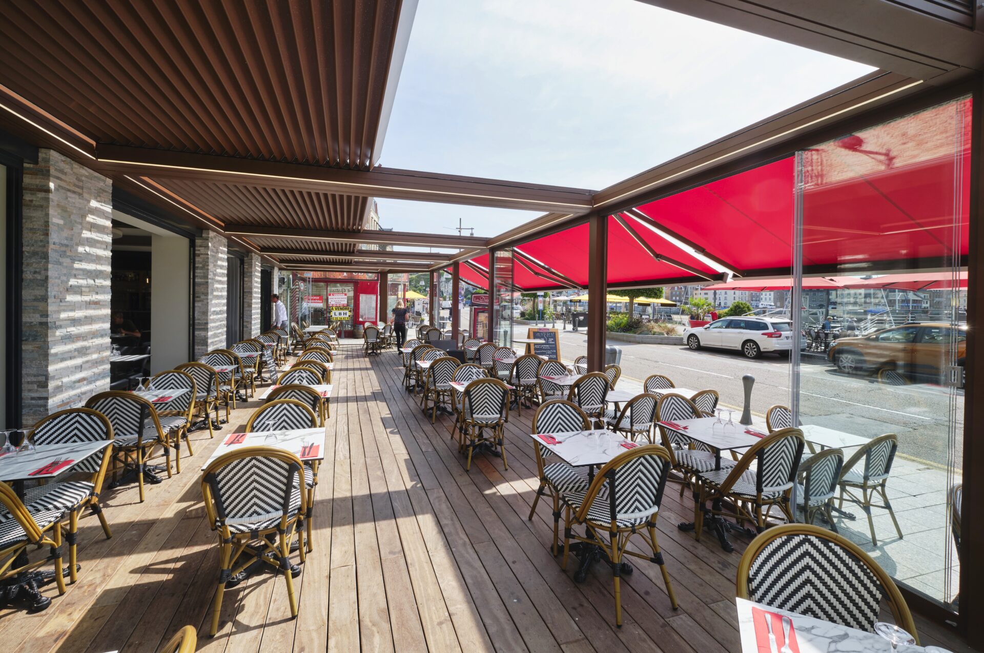 La Proprietà ha voluto ampliare e ottimizzare lo spazio fruibile del dehors, in precedenza dotato di tende a terra, soluzioni sostituite dalla tenda a pergola bioclimatica Kedry Skylife, funzionale, solida e dall’estetica più lineare grazie al tetto piano e da tende a bracci Qubica Light. Una volta chiusa con le vetrate panoramiche Line Glass, la pergola protegge dalla pioggia e dal vento in tutte le stagioni. La scelta delle vetrate Line Glass consente quindi da un lato di mantenere una visione completa e nitida dell’incredibile paesaggio del porto di Dieppe, e dall’altro, abbinata alle lamelle retrattili, di assicurare la perfetta luminosità degli ambienti interni.