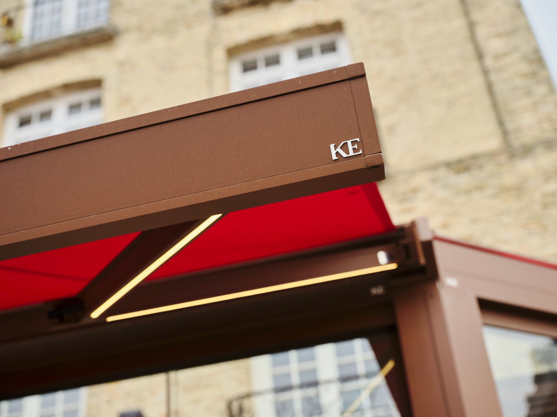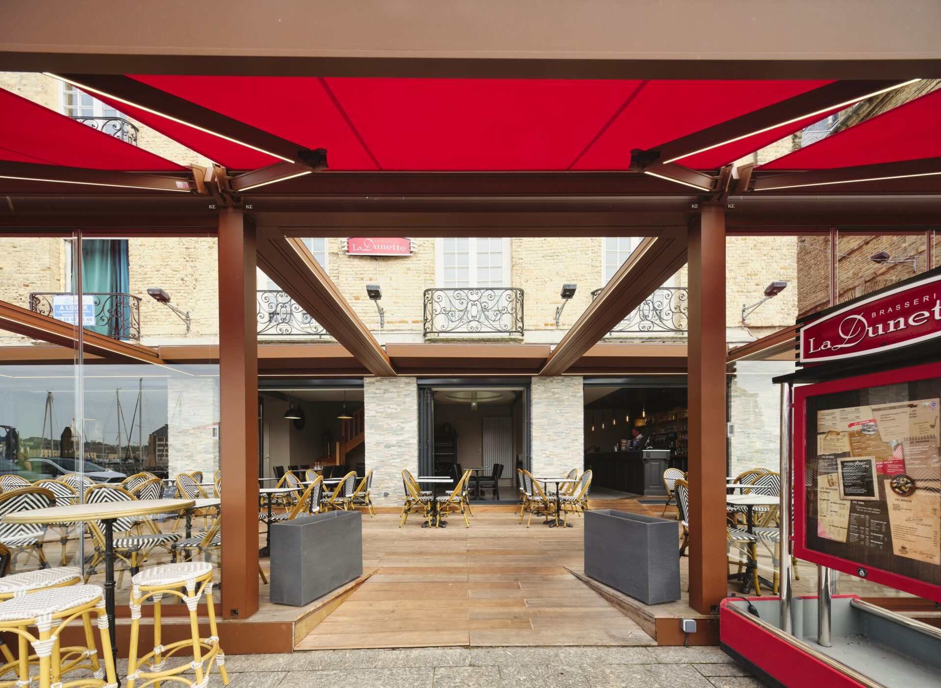 Un disegno studiato con precisione e dettaglio dall’ufficio PMO di KE. La facciata dell’edificio, dal fascino antico, è completamente rispettata, ancora una volta, dall’allineamento dei moduli rispetto all’architettura, ma anche dal colore RAL Corten, ruggine naturale, scelto per le diverse soluzioni. Il telo delle tende da sole della terrazza è stato scelto nel colore rosso, caratteristico del ristorante La Dunette e di grande personalità.