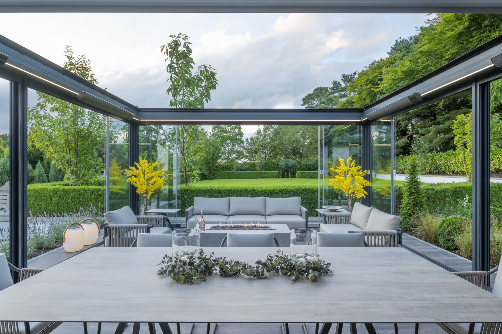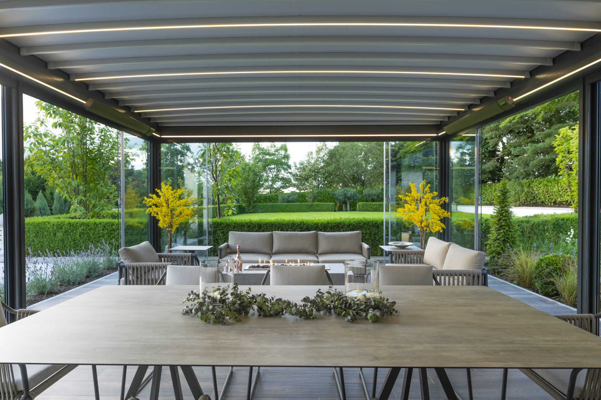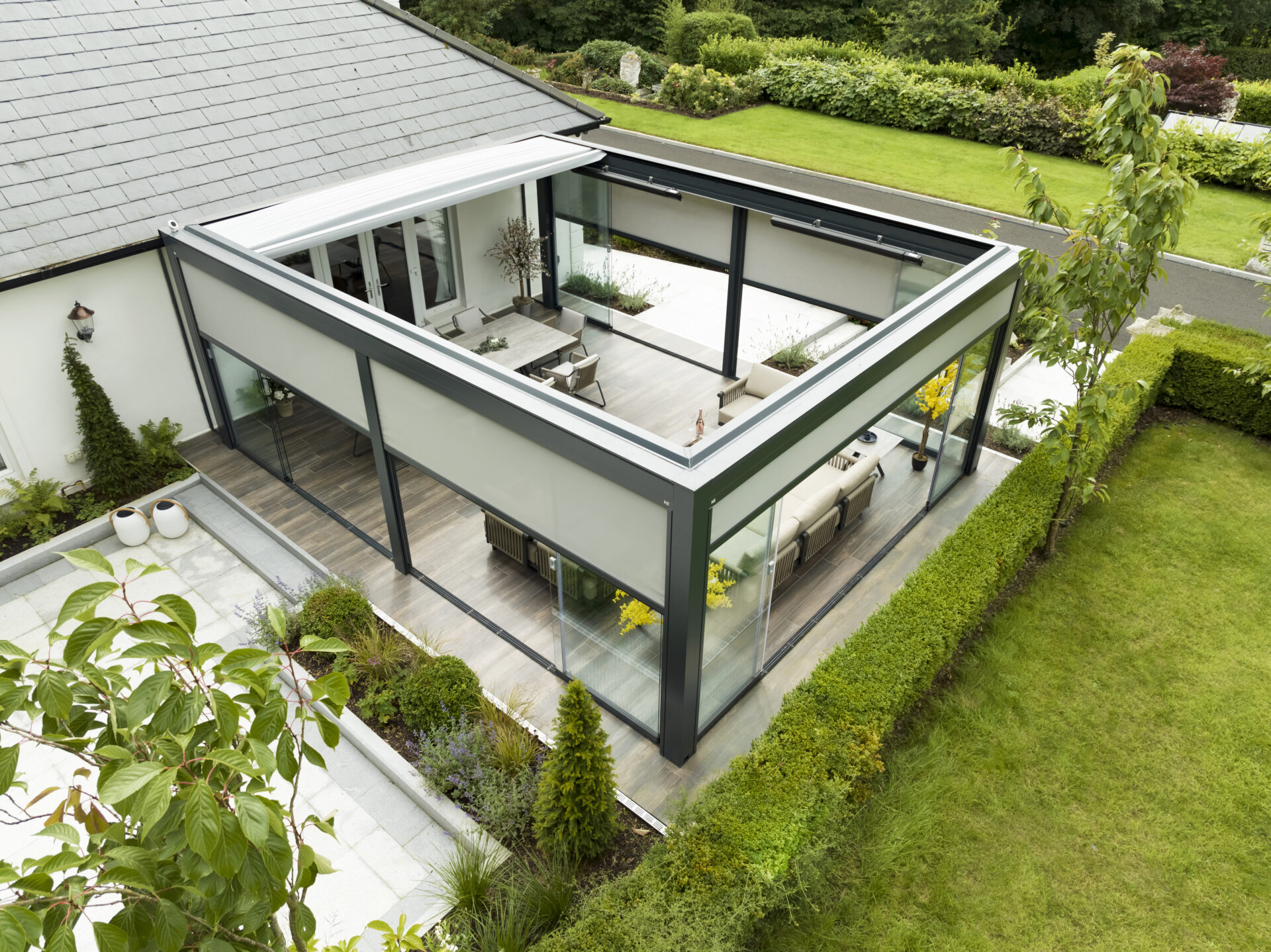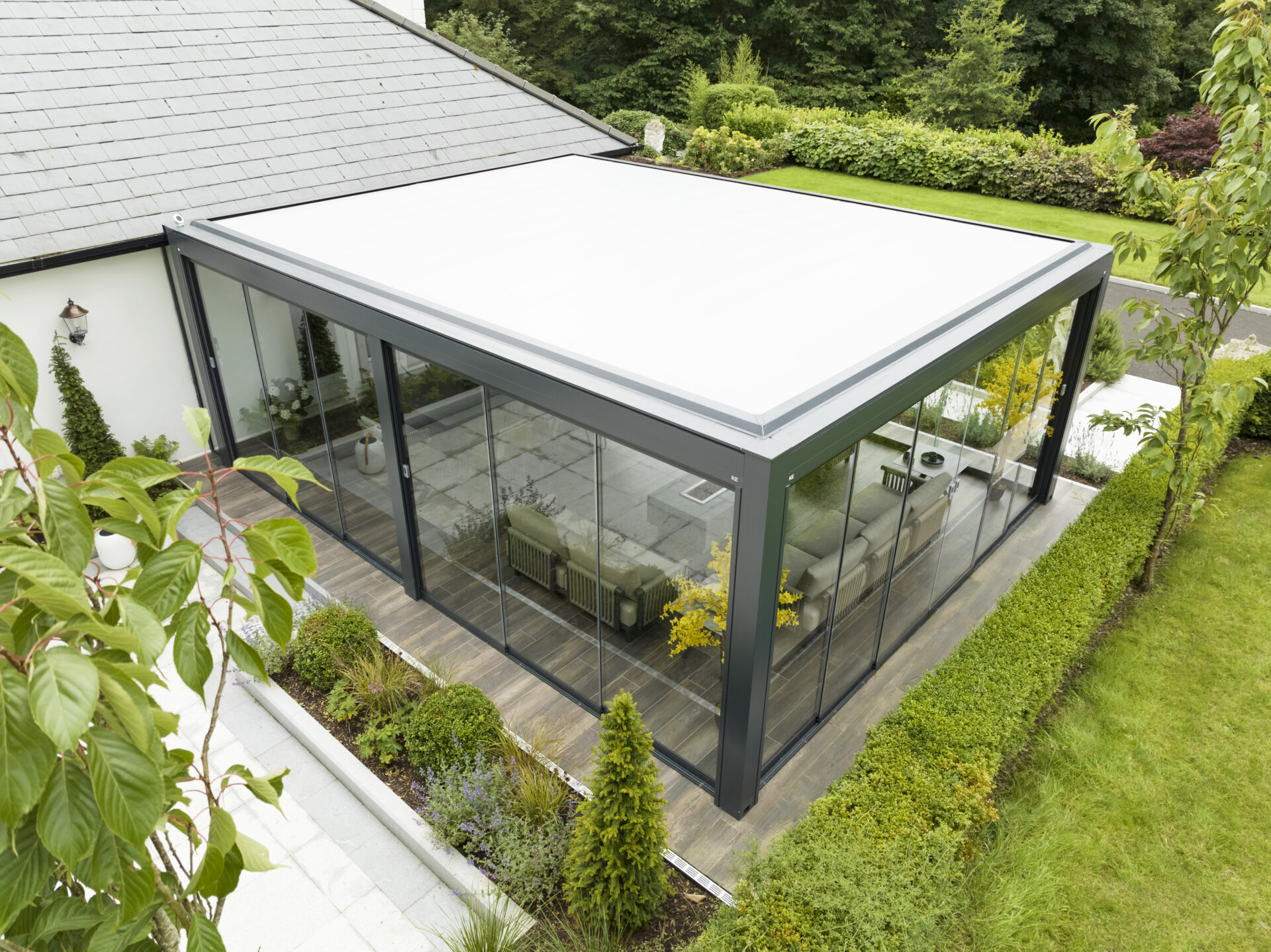 Per questo la Proprietà si è rivolta a KE per un progetto personalizzato e ha individuato nella tenda a pergola in alluminio dal design minimale Isola 3 la risposta perfetta alle necessità di questa realizzazione su misura. A completare la tenda a pergola, il sistema di chiusura a vetrate perimetrali Line Glass le cui alte prestazioni e l’effetto “tutto vetro” aumentano la luminosità degli ambienti e accentuano il contatto con il paesaggio circostante per godere della vista dell’incantevole giardino. La versatilità e la personalizzazione dei prodotti KE hanno permesso di realizzare un progetto su misura e dal carattere unico. La pergola è dotata di chiusure perimetrali Line Glass: la scelta del vetro è stata dettata dalla necessità di trattenere e sfruttare al massimo il calore del capriccioso sole irlandese. A completare il progetto le luci a LED sul perimetro esterno e interno consentono di godere della magnifica installazione ogni giorno dell’anno, a qualsiasi ora del giorno. Il colore della struttura è stato scelto per il suo l’aspetto contemporaneo.