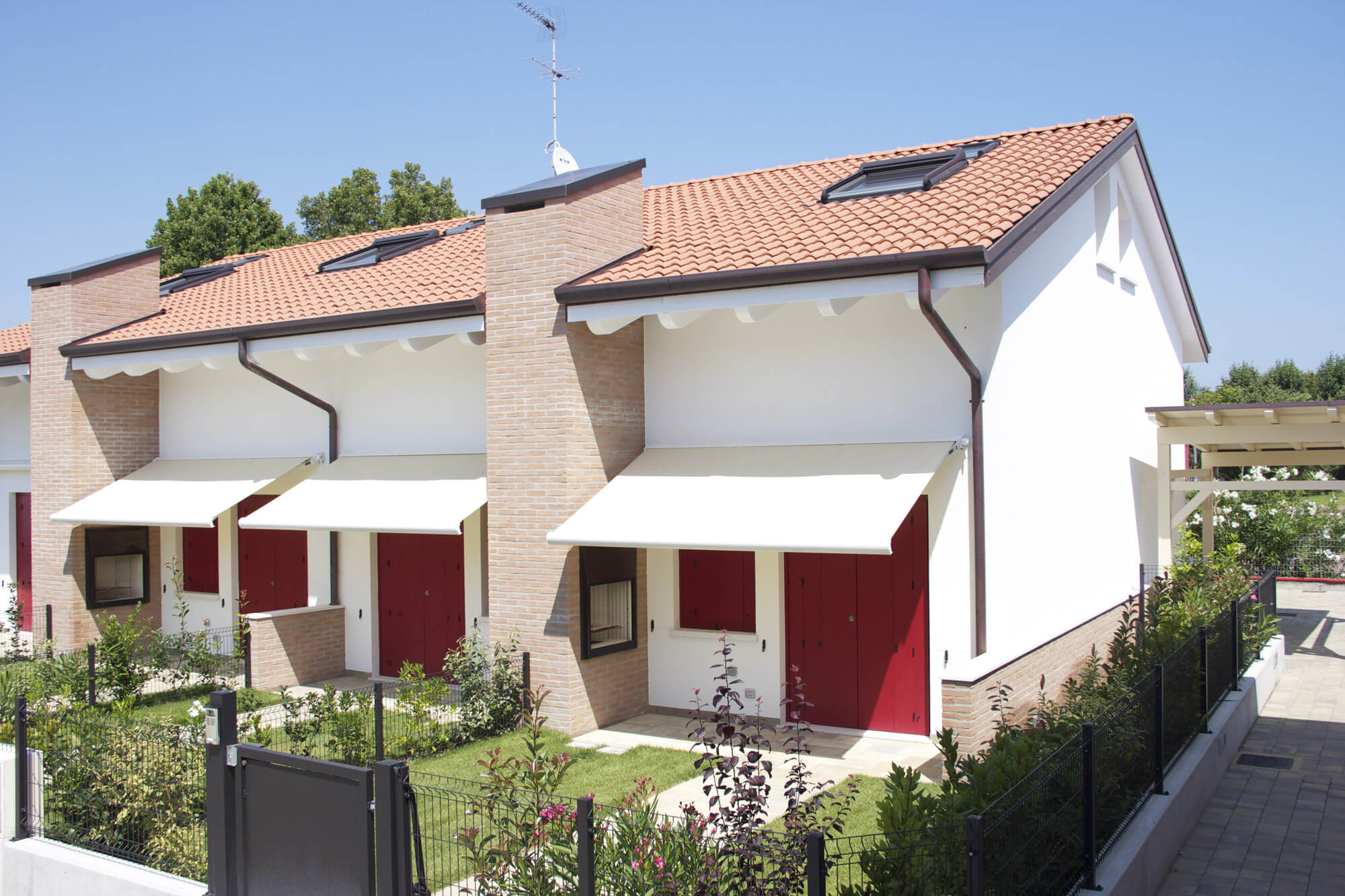 Tenda da sole con cassonetto a scomparsa totale con supporti laterali fissi che consentono l’installazione sia a parete che a soffitto. Vite di microregolazione per il corretto accoppiamento dei profili.